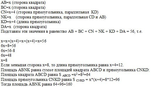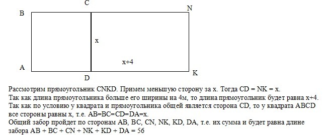 К квадратному земельному участку ABCD добавили прямоугольный участок CNKD длина которого на 4 м больше ширины оба участка загородили общим забором ABNKA длиною 56 м найдите площадь участка ABNK