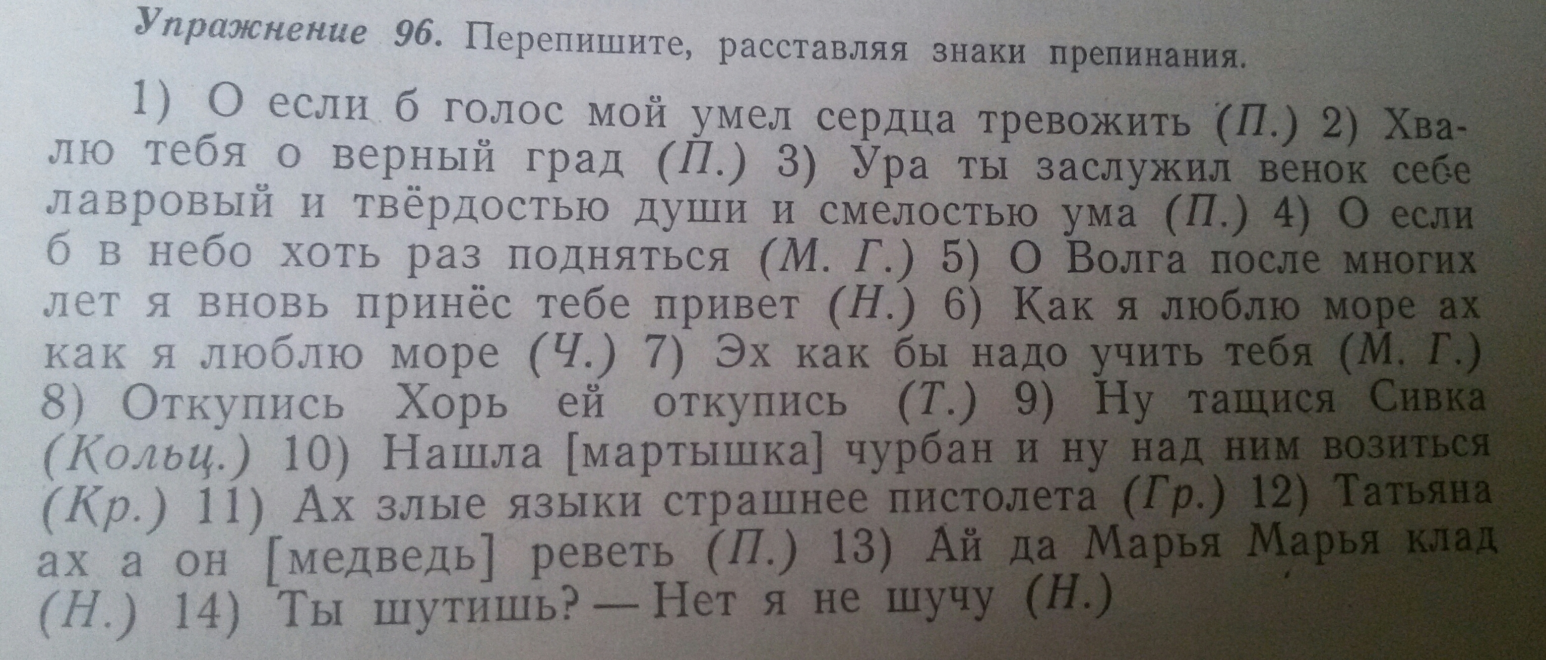1.О, если б голос мой умел сердца тревожить! 2.Хвалю тебя , о верный град! 3.Ура! ты заслужил венок себе лавровый и твёрдостью души, и смелостью ума. 4. О, если б в небо хоть раз подняться! 5.О, Волга! после многих лет я вновь принёс тебе привет. 6.Как я люблю море, ах, как я люблю море! 7.Эх, как бы надо учить тебя! 8.Откупись, Хорь, ей, откупись!9.Ну! тащися, Сивка! 10. Нашла {мартышка} чурбан, и ну над ним возиться! 11.Ах !злые языки страшнее пистолета. 12.Татьяна ах! а он реветь.13.Ай да Марья, Марья -клад! 14. "Ты шутишь?" - "Нет, я не шучу".