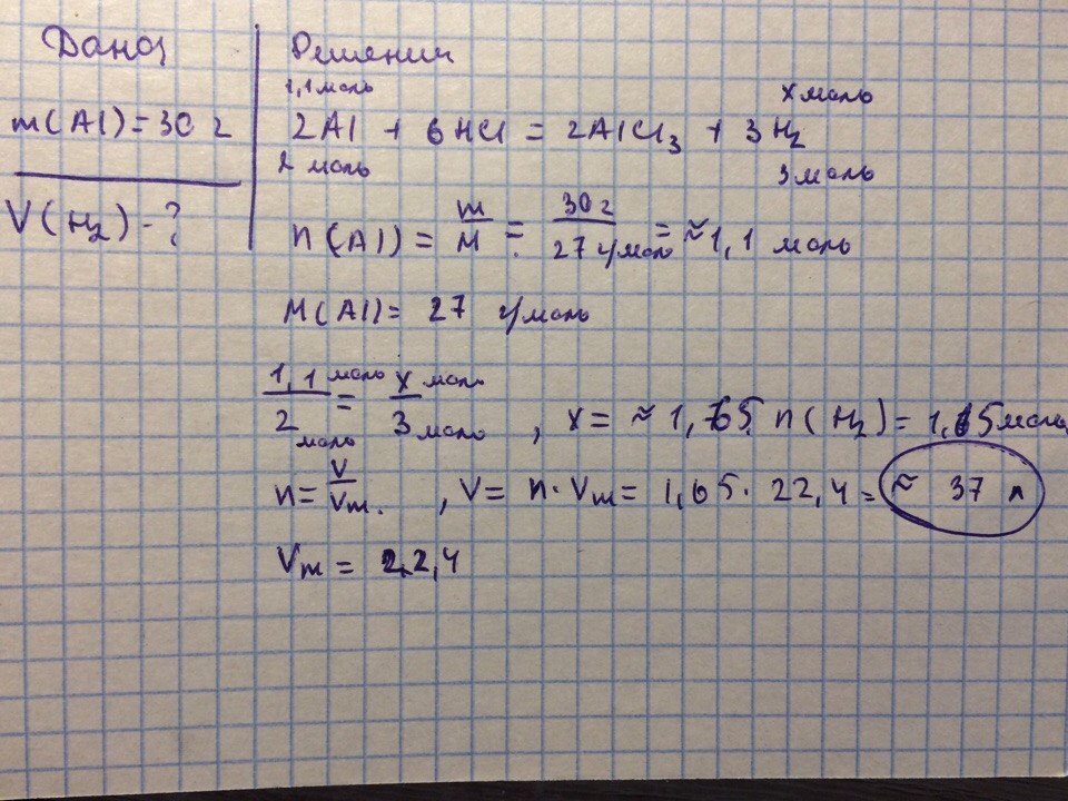 Какой объём водорода выделится если к 30 грамм алюминия прилили соляную кислоту?