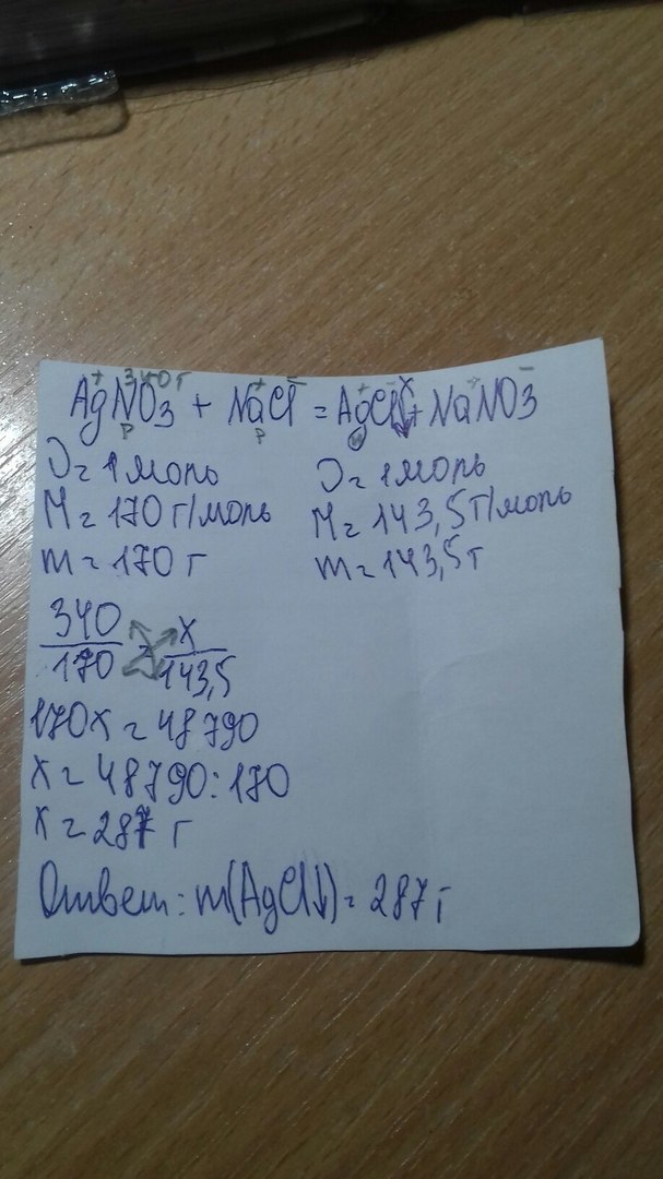 Определите массу осадка который получается при взаимодействии нитрата серебра массой 340г с хлоридом натрия РЕШЕНИЕ ПОЖАЛУЙСТА