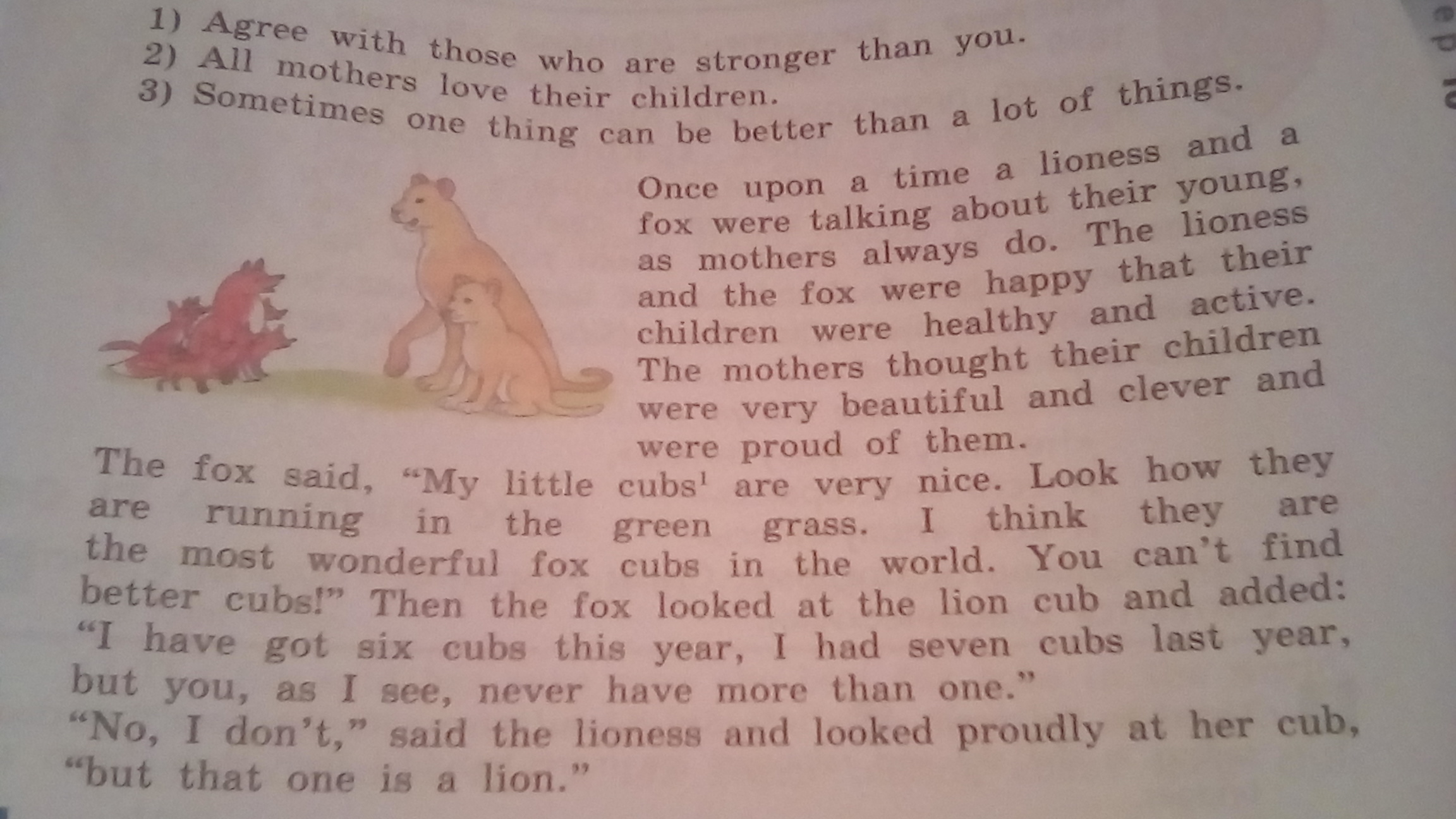 "Мои маленькие лисята очень милые. Смотри, как они бегают по зеленой траве. Я думаю, что они самые чудесные лисята на свете!" произнесла лиса. Затем лиса посмотрела на детёнышей львицы и добавила: "В этом году я родила шесть детёнышей, в прошлом семь, а ты, как я вижу, не больше одного."