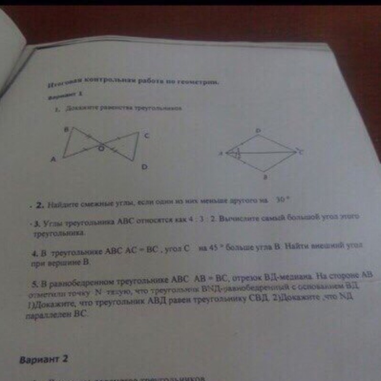 1. АО=ОС;ВО=ОД; угол О-общий, значит эти треугольники равны (Первый признак равенства треугольников)