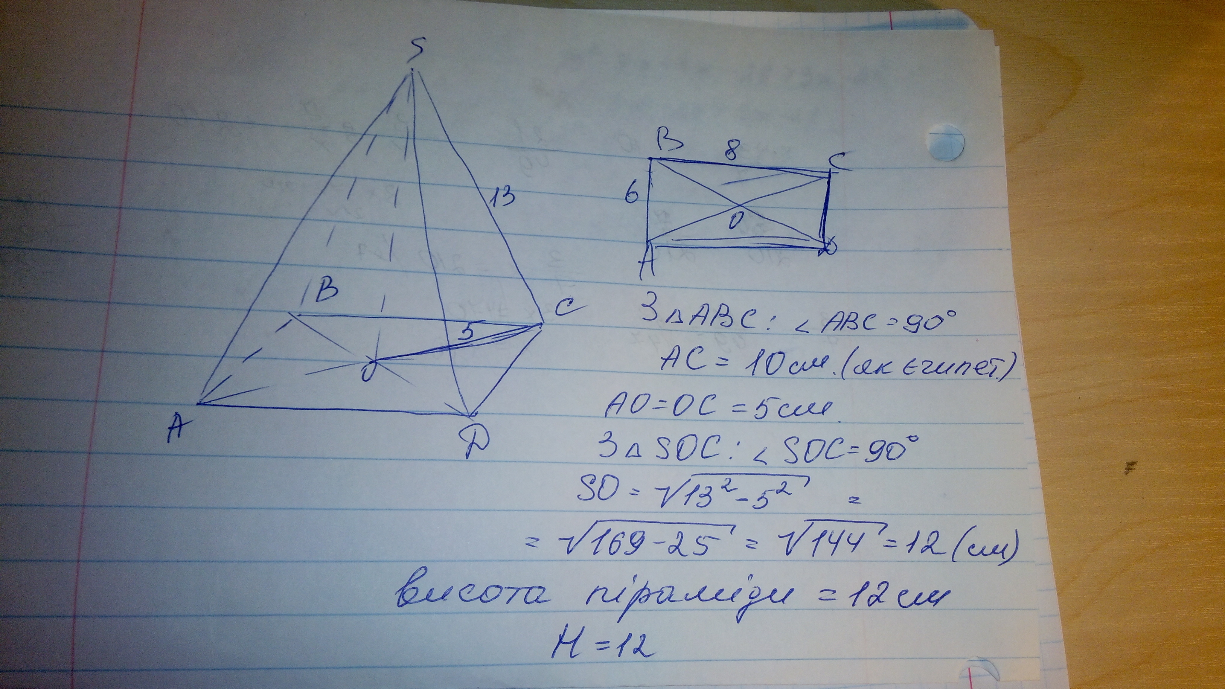 Оовую піраміди є прямокутник Із сторонами 6 і 8 см кожне бічне ребро піраміди дорівнює 13 см визначити висоту піраміди