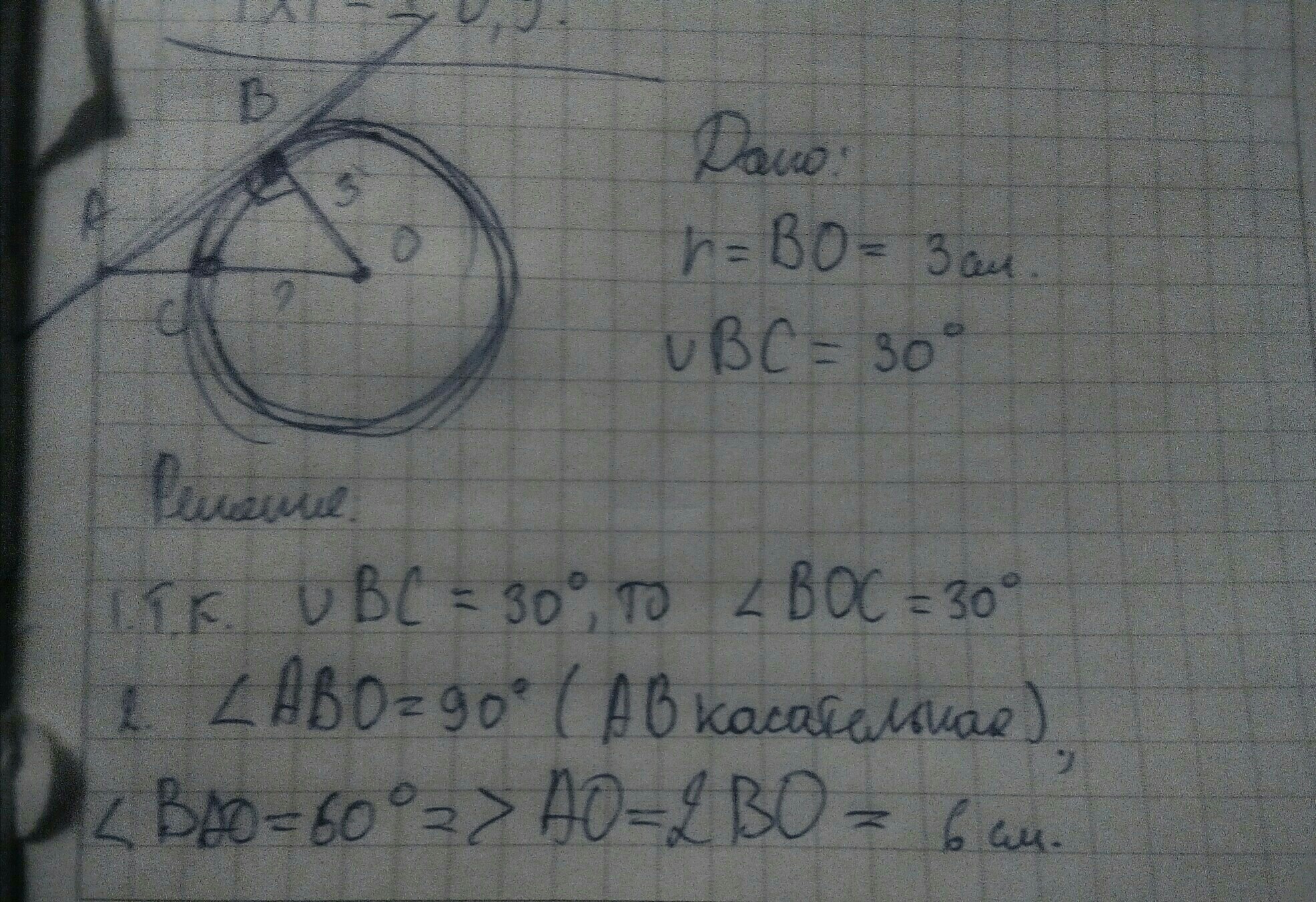 Прямая AB касается окружности с центром O в точке B. Найдите AO, если радиус окружности – 3 см, а хорда, один конец которой совпадает с точкой касания, а второй – с точкой пересечения окружности и прямой AO, стягивает дугу 30°.