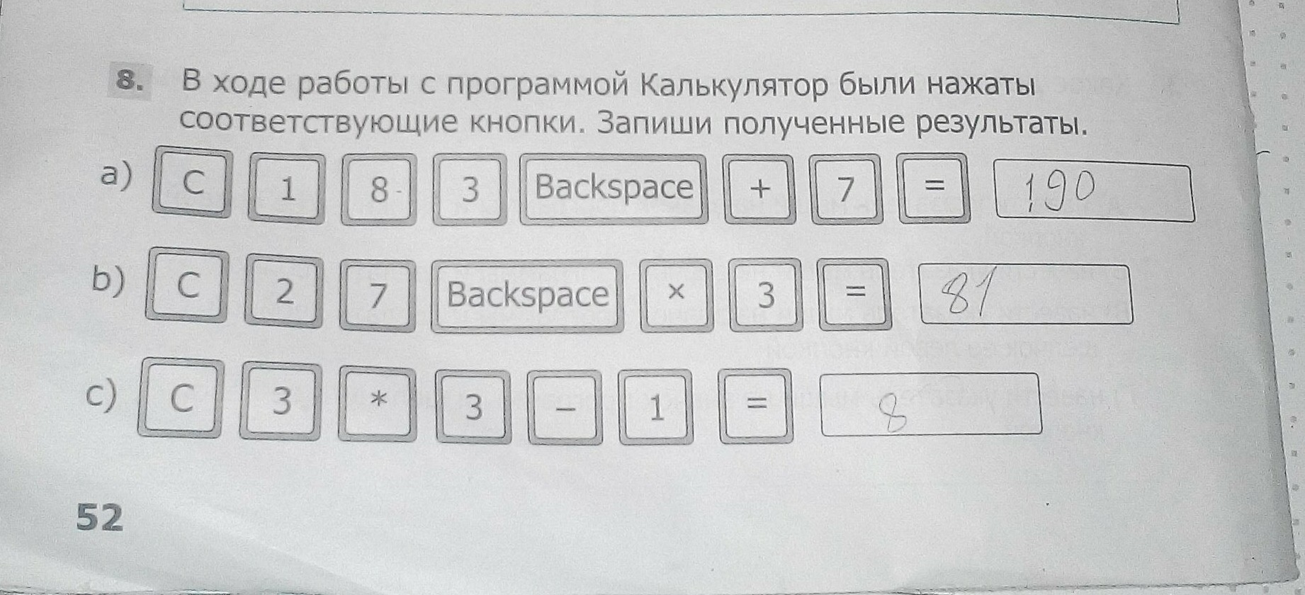 В ходе работы с программой Калькулятор были нажаты соответствующие кнопки.Запиши полученные результаты.