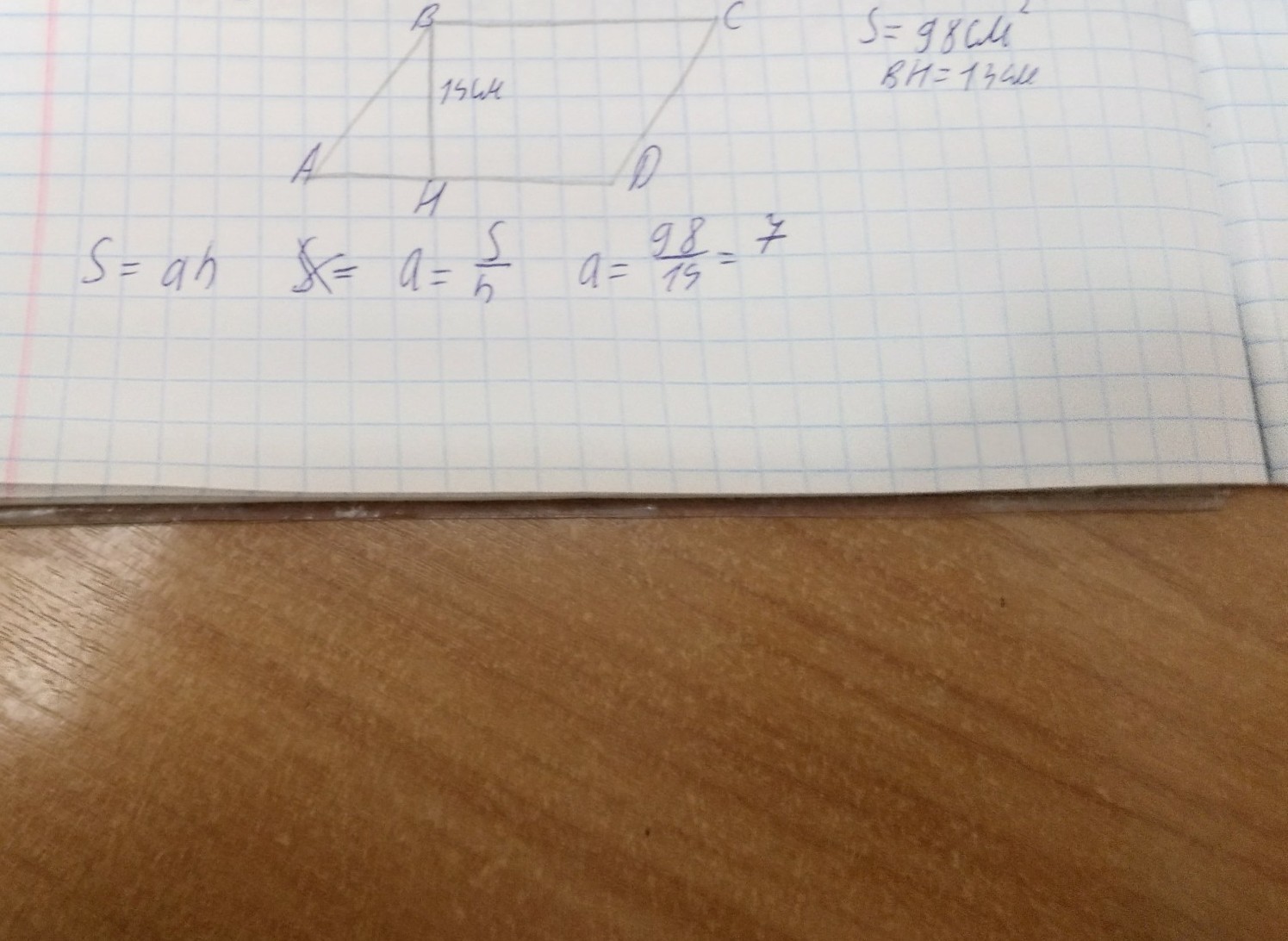Площадь параллелограмма равна 98 см^2,а одна из его высот - 14 см.Найдите сторону параллелограмма,к которой проведена эта высота.