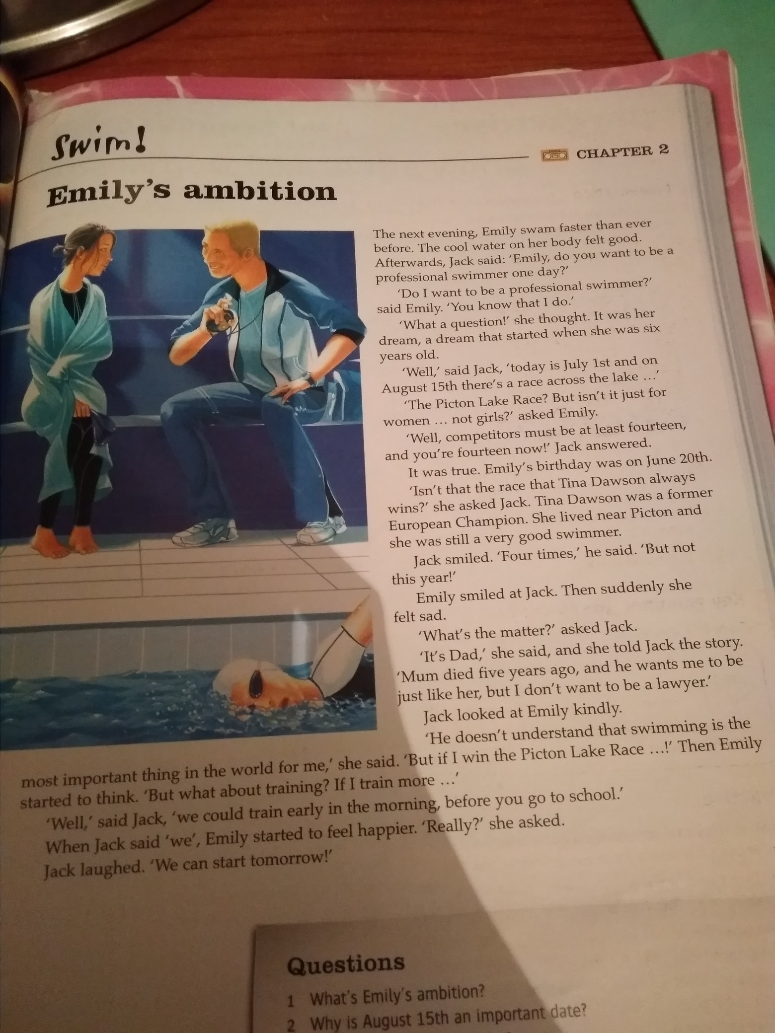 На следующий день, Эмилия плавала лучше, чем когда бы то ни было. Вода приятно охватывала тело. Джек спросил: "Эмилия, ты хочешь стать профессиональным пловцом однажды?