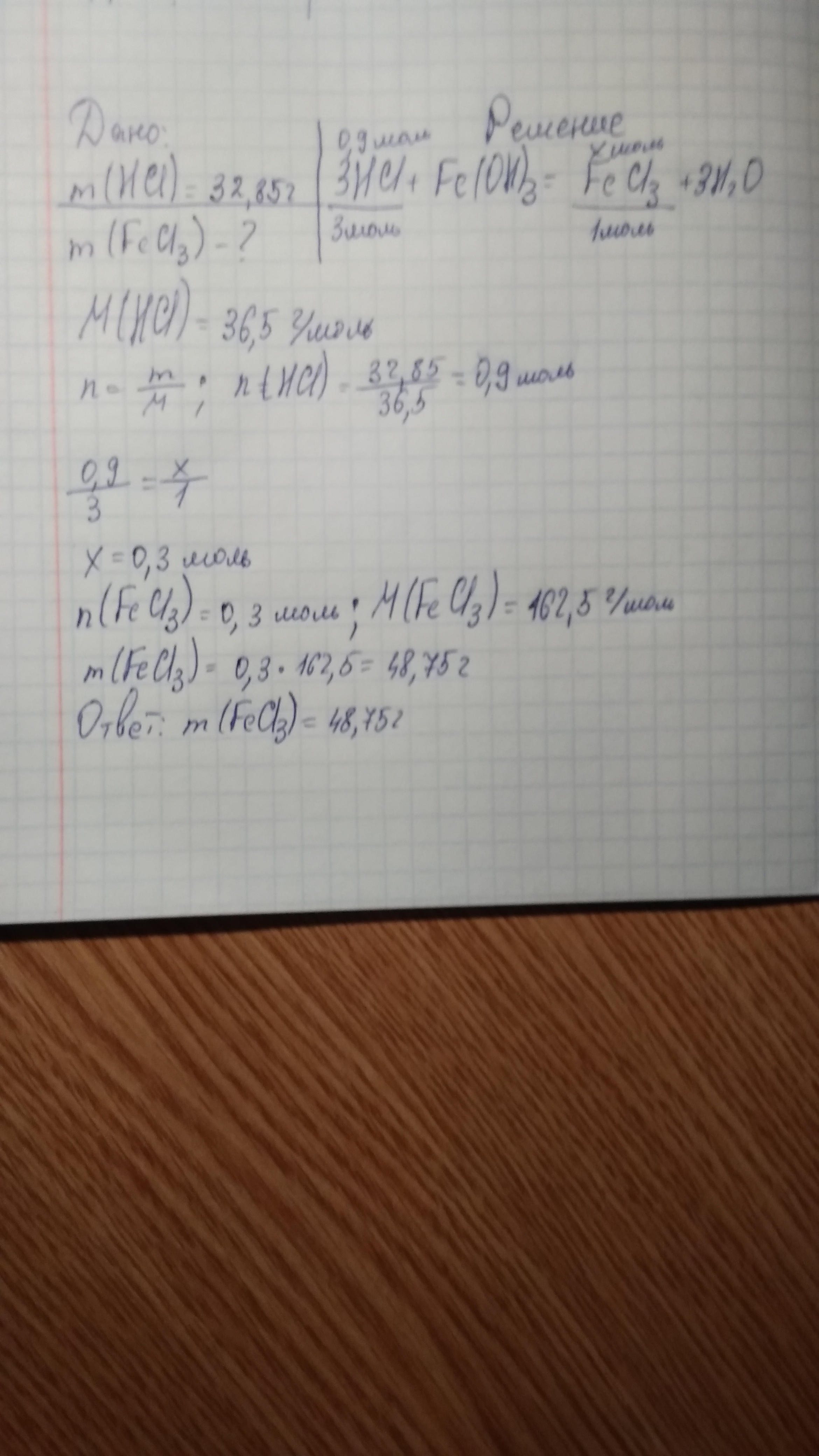 Вычислите массу хлорида железа 3(римская), образующегося при взаимодействии гидроксида железа 3(римская) с соляной кислотой массой 32,85г.