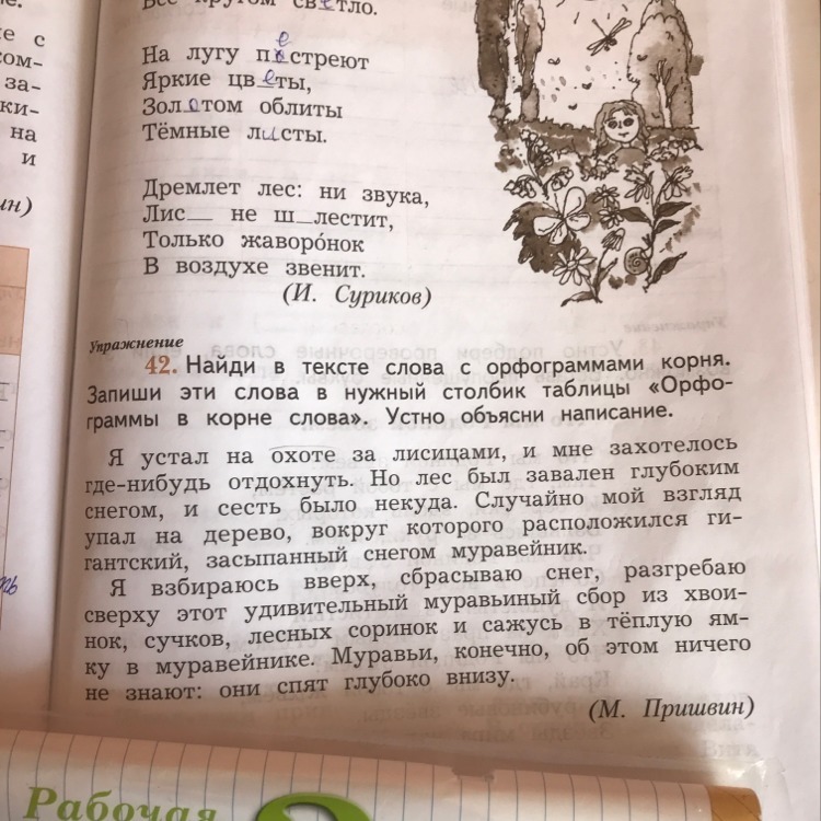 Найди в тексте слова с орфограммами корня. Запиши эти слова в нужный столбик таблицы