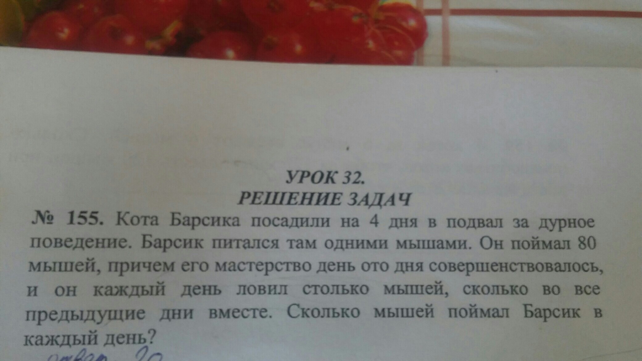 Решаем методом подбора. В первые два дня он ловил по 10 мышей, в третий день поймал уже 20, а в четвёртый - 40!