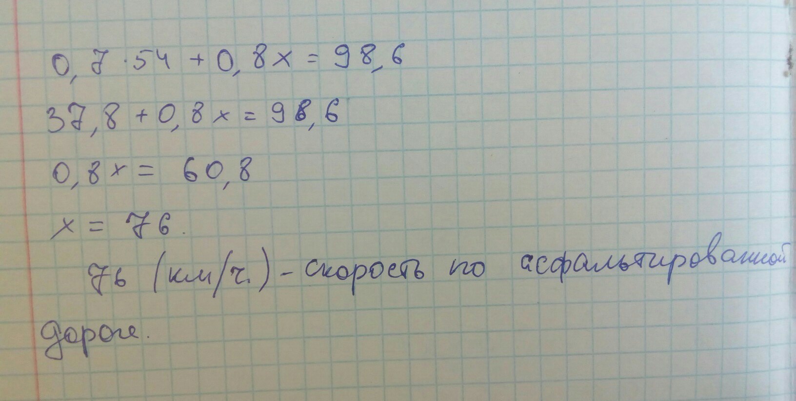 Мотоциклист ехал 0,8ч по асфальтированной дороге и 0,7ч по грунтовой , проехав всего 98,6км. С какой скоростью двигался он по асфальтированной дороге если по грунтовой он ехал 54 кмч?