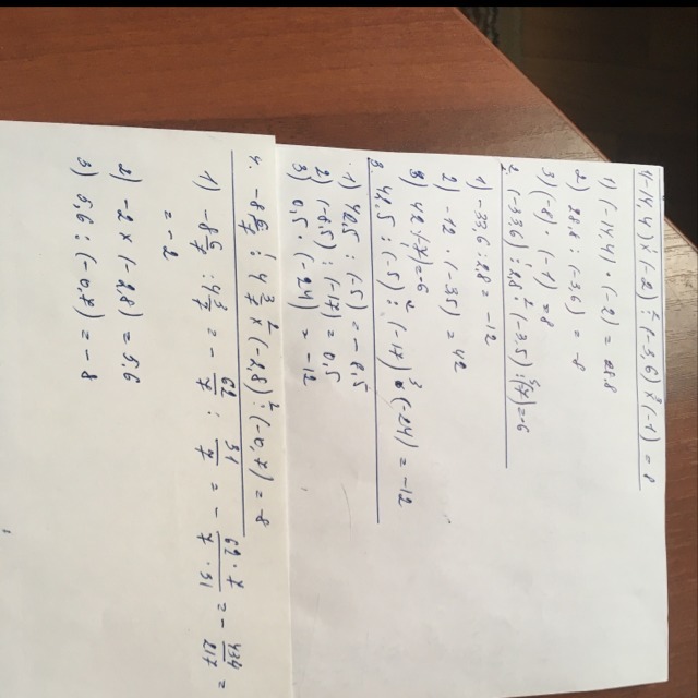 Найдите значение выражения:1) (-14,4)×(-2)÷(-3,6)×(-1); 2) (-33,6)÷2,8×(-3,5)÷(-7); 3) 42,5÷(-5)÷(-17)×(-24); 4) -8 6/7÷4 3/7×(-2,8)÷(-0,7)