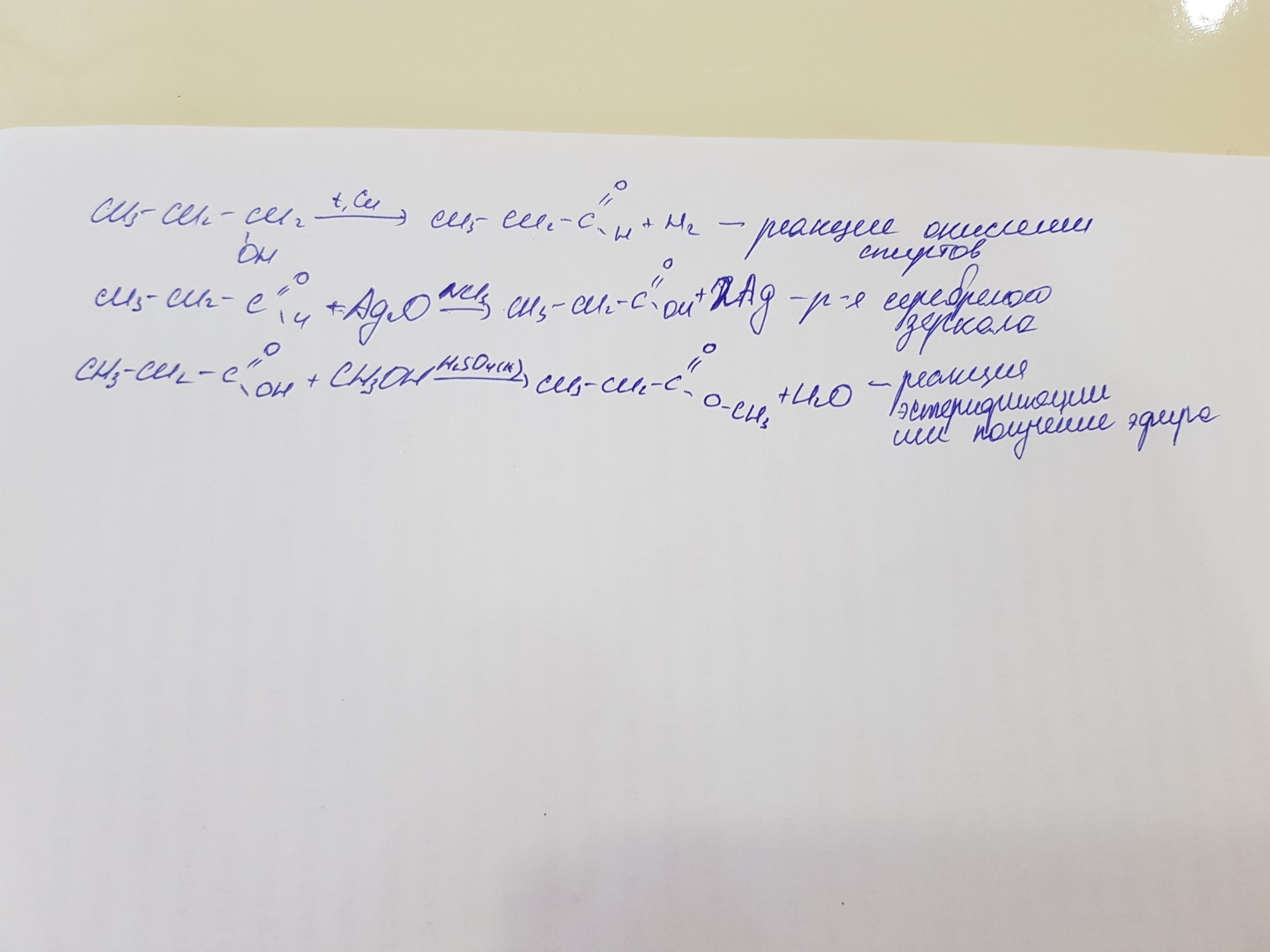 Напишите уравнение реакций, с помощью которых можно осуществить превращения:Пропанол-пропаналь-пропановая кислота- метиловый эфир пропановой кислоты. укажите типы реакций, условия их осуществления
