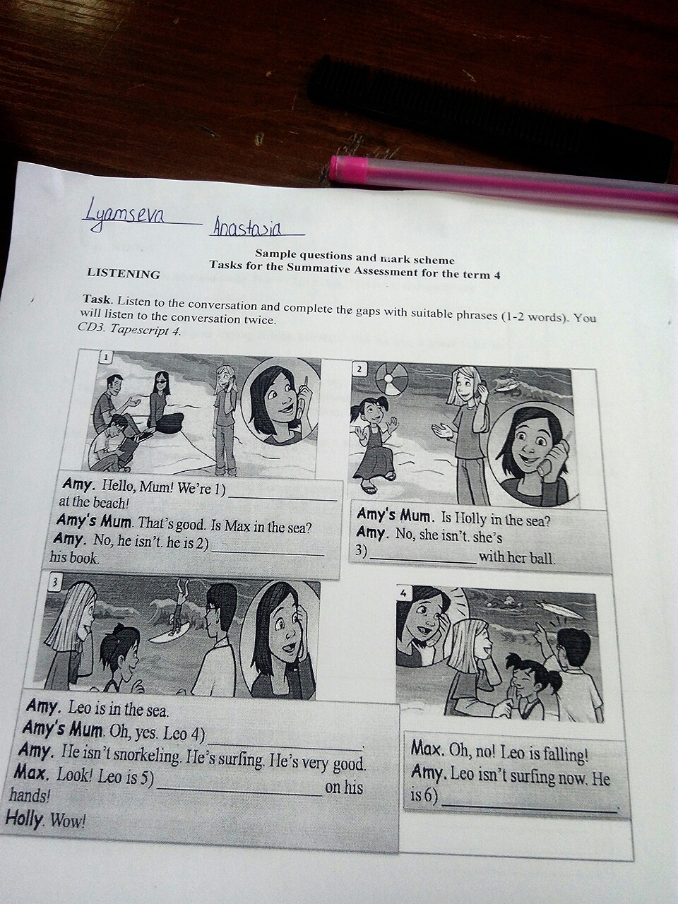 1. Amy: Hello, Mum! We're having fun at the beach!