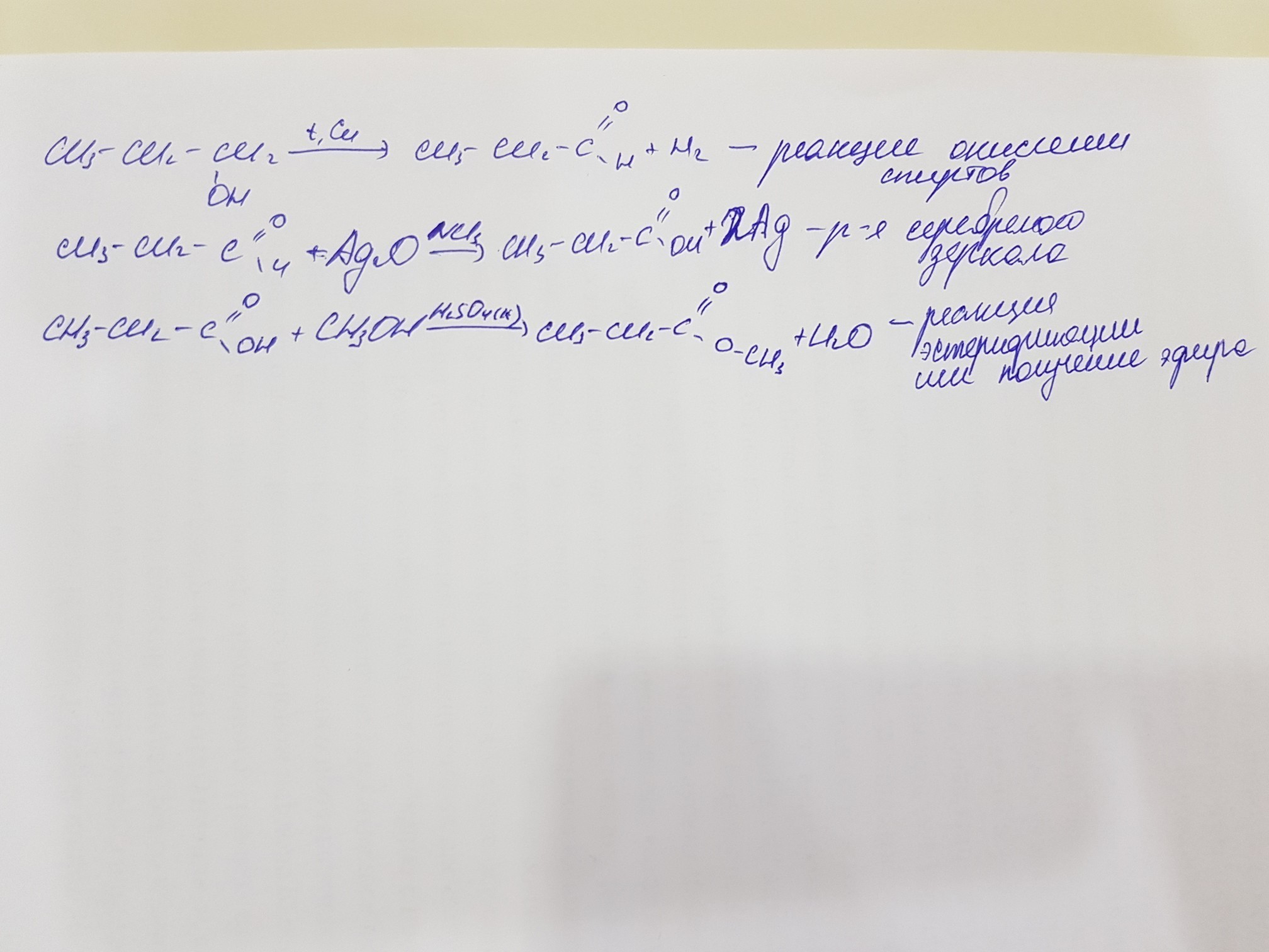 Напишите уравнение реакций, с помощью которых можно осуществить превращения:Пропанол-пропаналь-пропановая кислота- метиловый эфир пропановой кислоты. укажите типы реакций, условия их осуществления