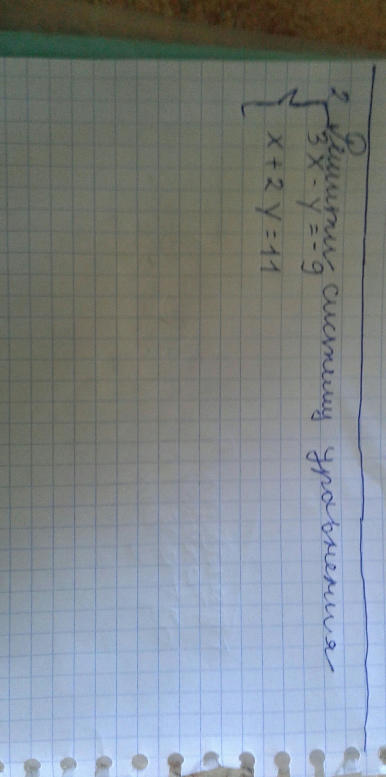 left { {{3x-y=-9} atop {x+2y=11}} right.  left { {{y=9+3x} atop {x+2y=11}} right.\