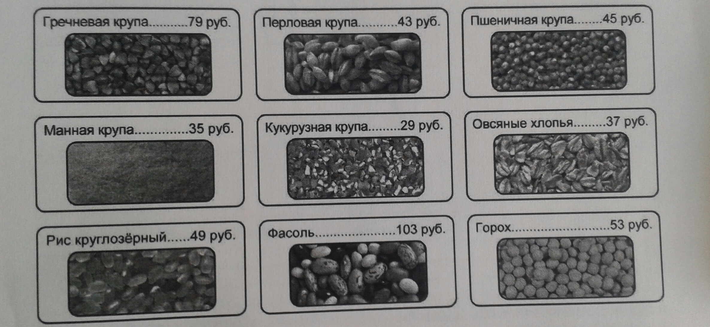 В магазине продаются бакалейные товары в упаковках. На рисунке показаны цены. Сколько всего рублей надо заплатить за две упаковки риса и одну упаковку кукурузной крупы?