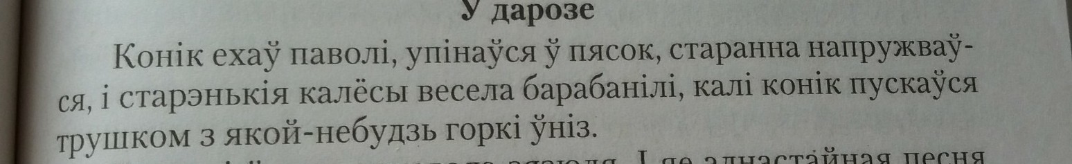 Коник(дзейник) ехау(выказник) паволи,упинауся у пясок,старанна напружвауся(акаличнасть),и(никак,эт частица) старэнькия(азначенне) калёсы(дзейник) весела(акаличнасть) барабанили(выказник),кали коник пускауся трушком з якой-небудзь горки униз(акаличнасть)