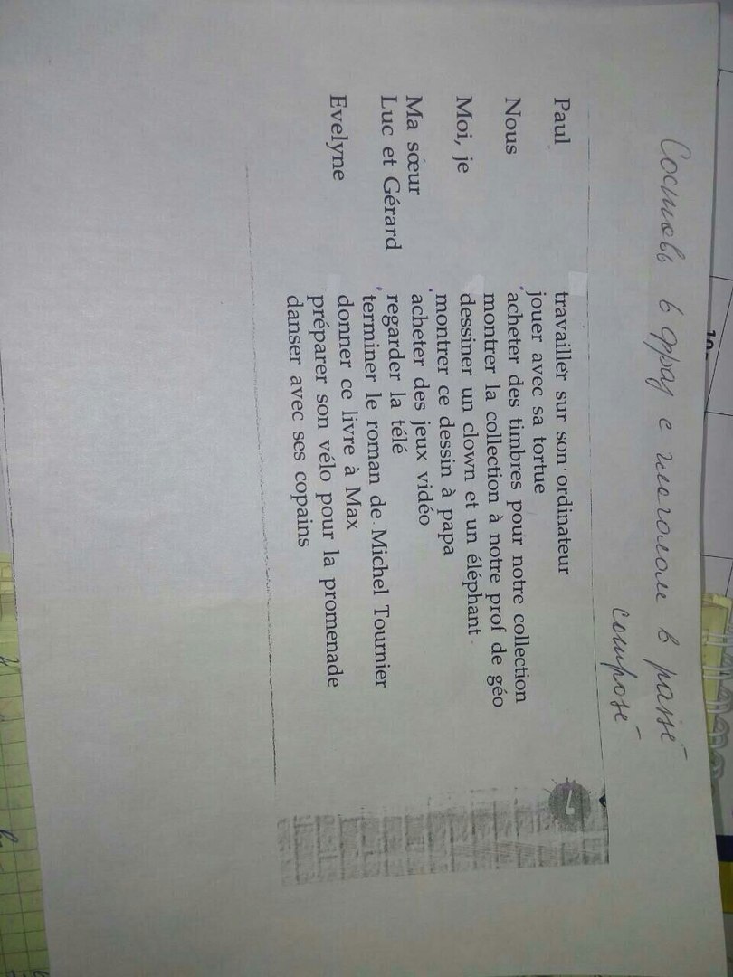 Paul a travaillé sur son ordinateur. Il a joué avec sa tortue.Nous avons acheté des timbres pour notre collection. Nous avons montré la collection à notre prof de géo.Moi j'ai dessiné un clown et un éléphant. J'ai montré le dessin à papa.Ma sœur a acheté des jeux vidéo. Elle a regardé la télé. Luc et Gérard ont terminé le roman de Michel Tournier. Ils ont donné ce livre à Max.Évelyne a préparé son vélo pour la promenade. Elle a dansé avec ses copains.