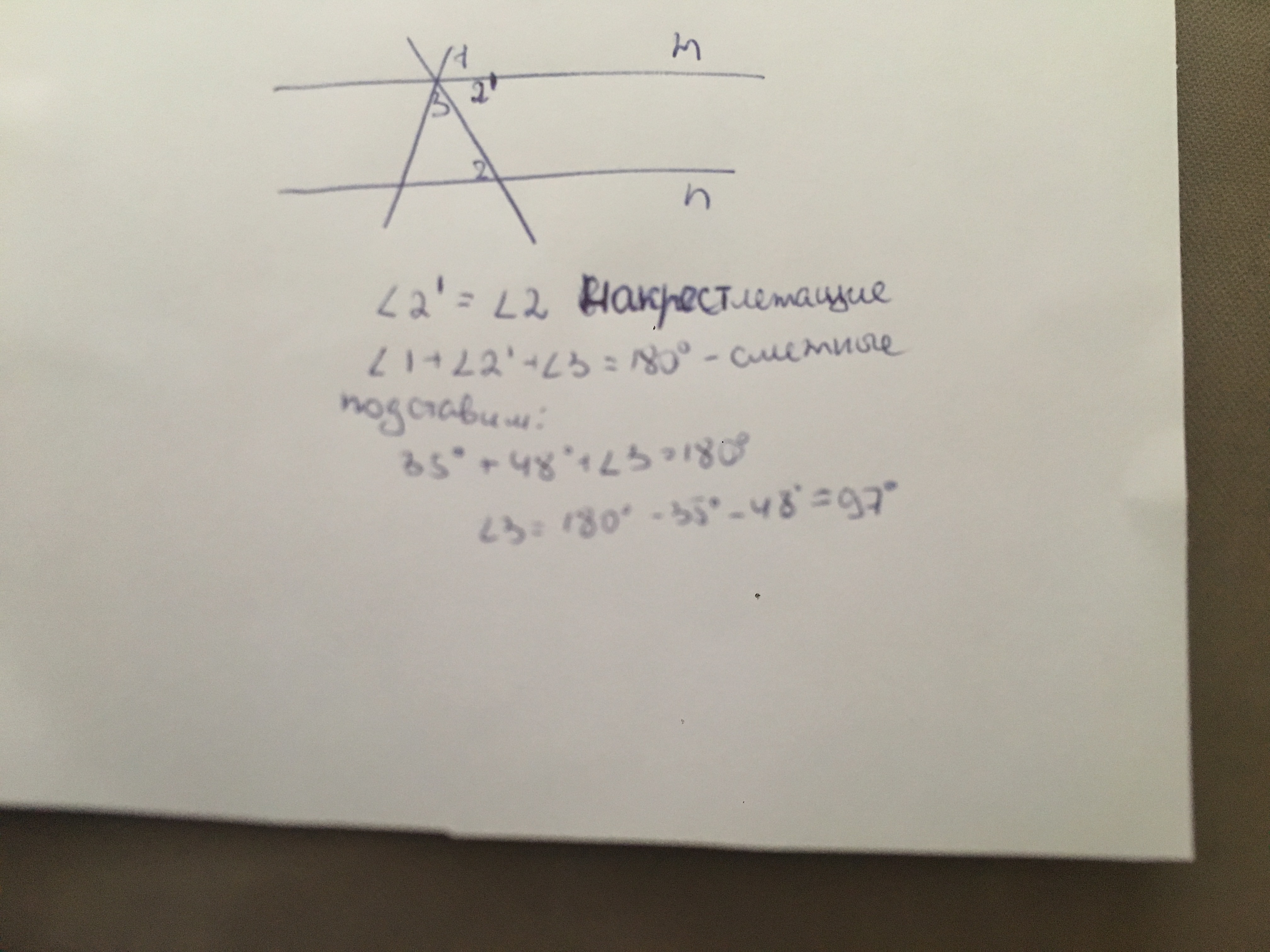 Вроде вот. Угол 2= углу 2’ - накрестлежащие, углы 1+2’+3=180, т. к. смежные. Угол 3=180-35-48=97