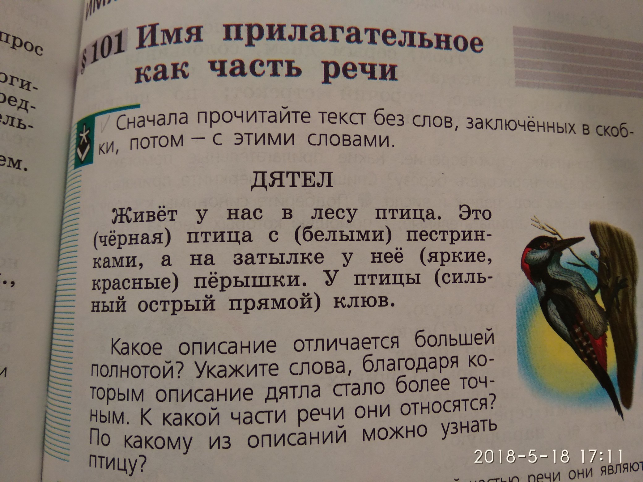 Живёт у нас в лесу птица. Это чёрная птица с белыми пестринками, а на затылке у неё яркие, красные пёрышки. У птицы сильный, острый, прямой клюв. (С прилагательными)