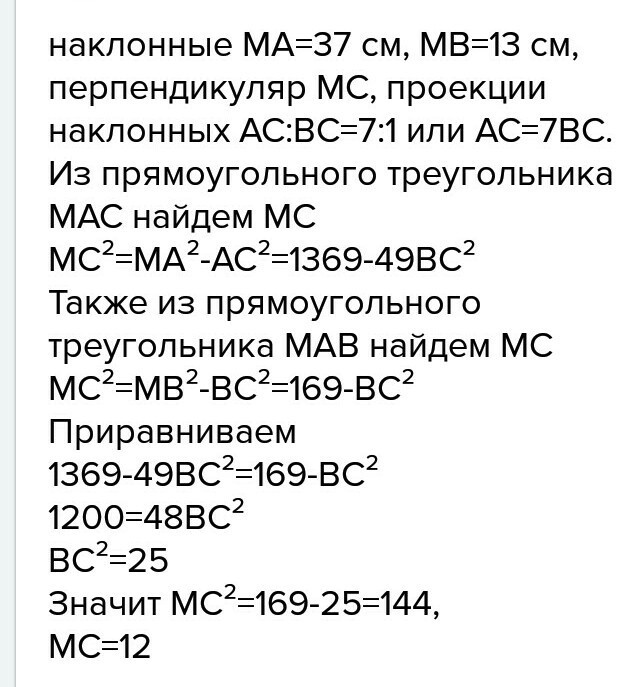 из точки m взятой вне плоскости бета, проведены к ней две наклонные, равные 37см и 13см.Проекции этих наклонных относятся как 7:1. Определите расстояние от точки m до плоскости