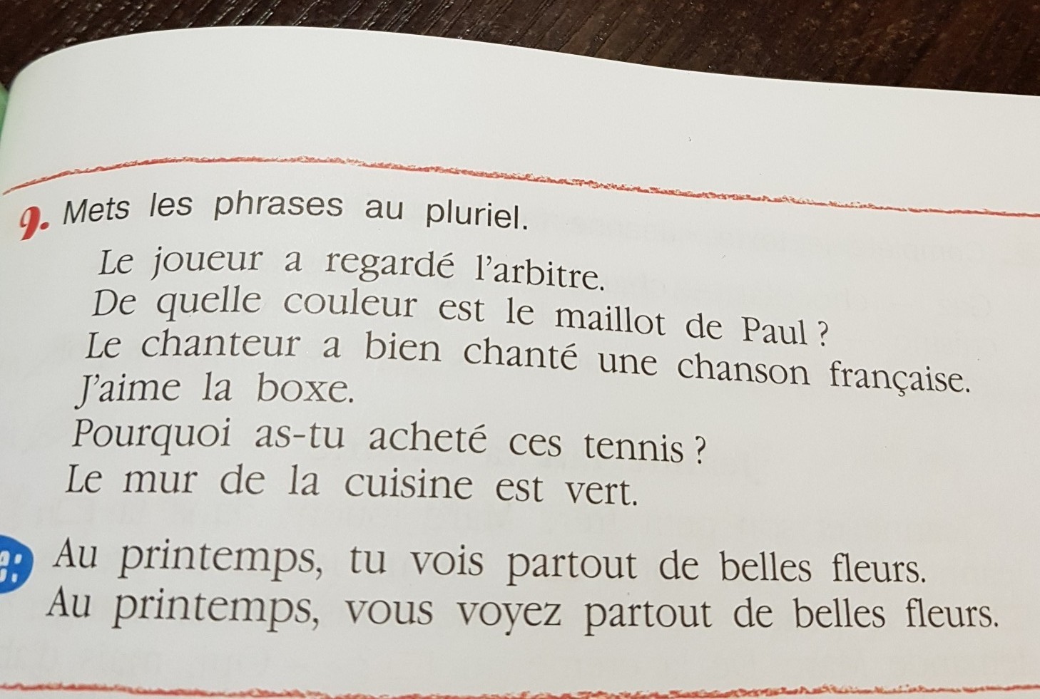 Les joueurs ont regardé l'arbitre.De quelles couleurs sont les maillots de Paul ?Les chanteurs ont bien chanté des chansons françaises.Nous aimons la boxe.Pourquoi avez-vous acheté ces tennis ?Les murs de la cuisine sont verts.