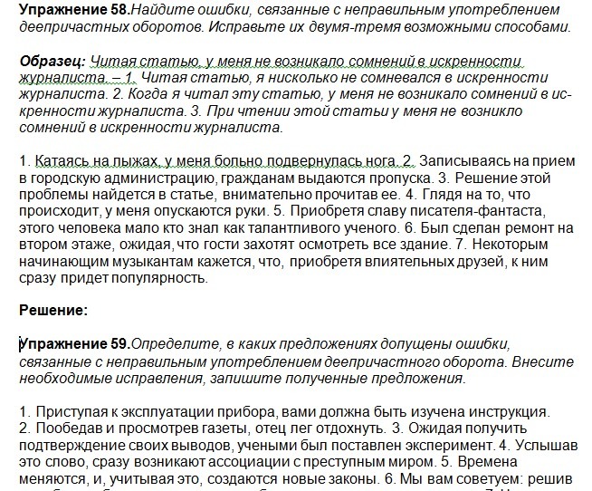 58. 1) Катаясь на лыжах, я больно подвернула ногу. Когда я каталась на лыжах, у меня больно подвернулась нога. Во время катания на лыжах у меня больно подвернулась нога. 2) Записавшись на приём в городскую администрацию, граждане получают пропуска. Когда граждане записываются на приём в городскую администрацию, им выдаются пропуска. При записи на приём в городскую администрацию граждане получают пропуска. 3) Внимательно прочитав статью, можно найти решение этой проблемы. Решение этой проблемы найдётся в статье, если внимательно прочитать её. При внимательном прочтении статьи найдётся решение этой проблемы. 4) У меня опускаются руки, когда я смотрю на то, что происходит. При наблюдении за тем, что происходит, у меня опускаются руки. 5) Когда этот человек приобрёл славу писателя-фантаста, мало кто знал его как талантливого учёного. Приобретя славу писателя-фантаста, этот человек мало кому был известен как талантливый учёный. После приобретения славы писателя-фантаста этот человек мало кому был известен как талантливый учёный. 6) Ожидая, что гости захотят осмотреть всё здание, мы сделали ремонт на втором этаже. Мы сделали ремонт на втором этаже, когда гости захотели осмотреть всё здание. Из-за желания гостей осмотреть всё здание мы сделали ремонт. 7) Некоторым начинающим музыкантам кажется, что, когда/если они приобретут влиятельных друзей, к ним сразу придёт популярность. Некоторым начинающим музыкантам кажется, что при приобретении влиятельных друзей к ним сразу придёт популярность. Некоторым начинающим музыкантам кажется, что, приобретя влиятельных друзей, они сразу станут популярными.