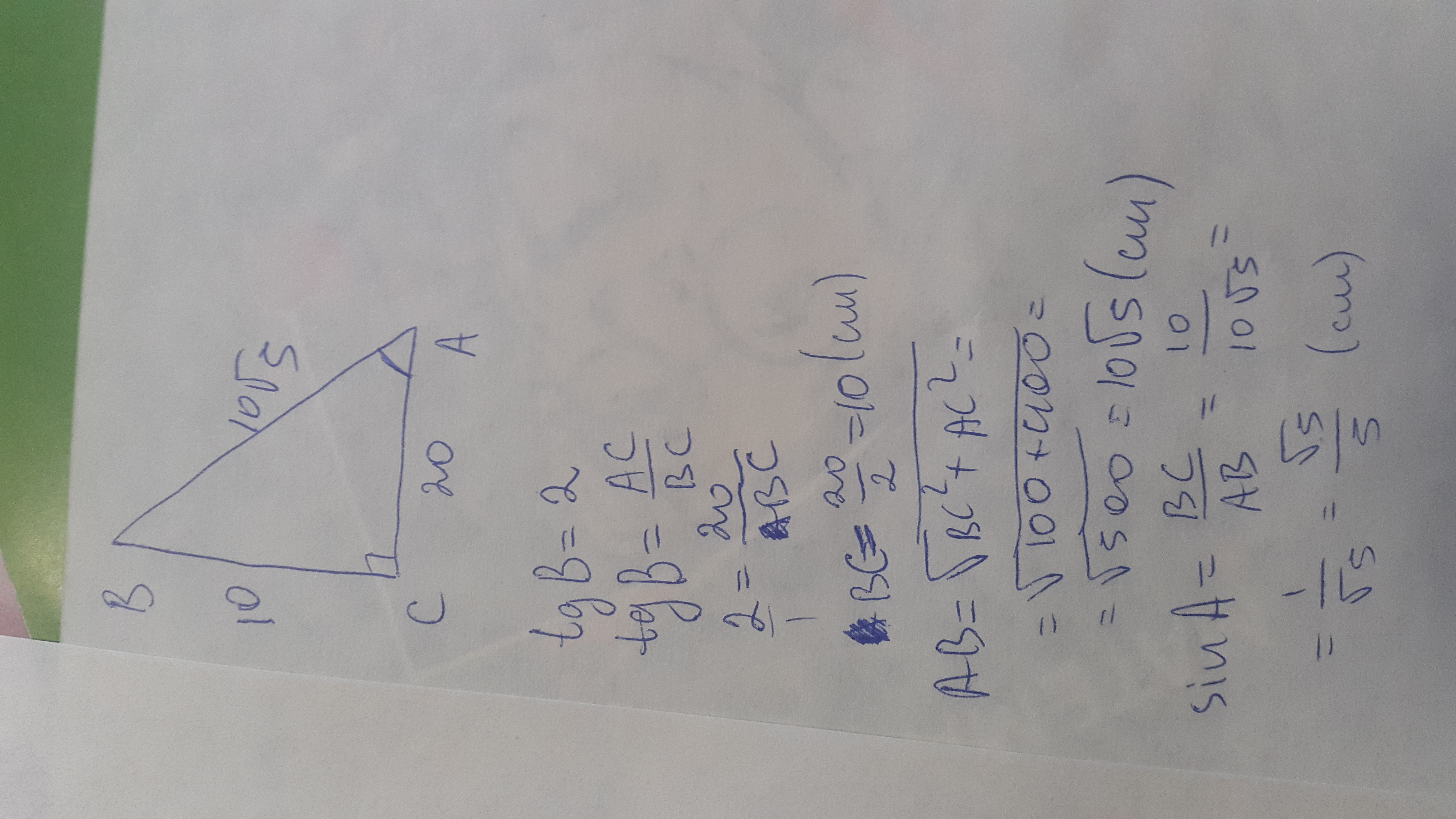 у прямокутному трикутнику abc : ac =20 см, tg b = 2. Знайти bc, sin A