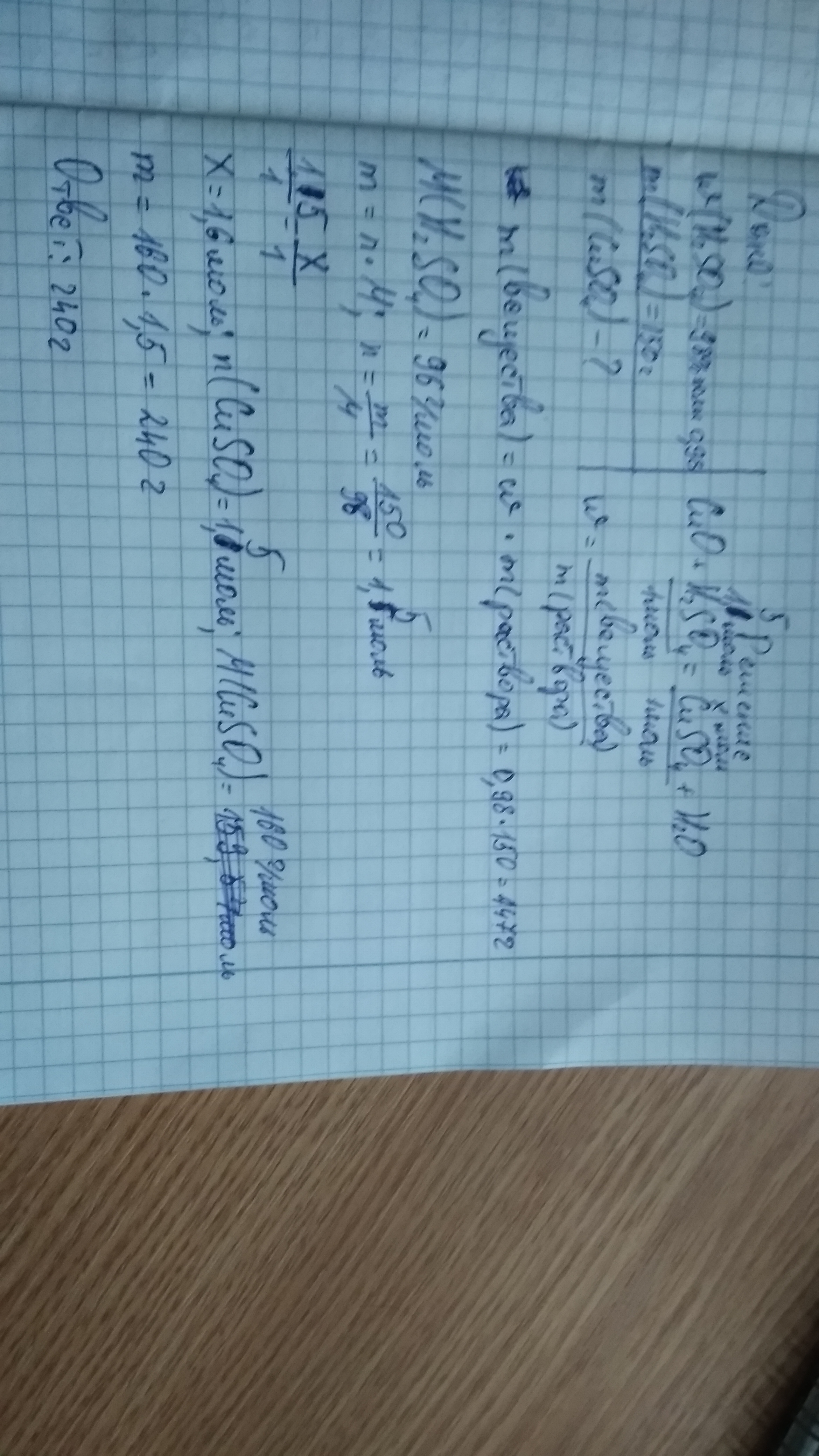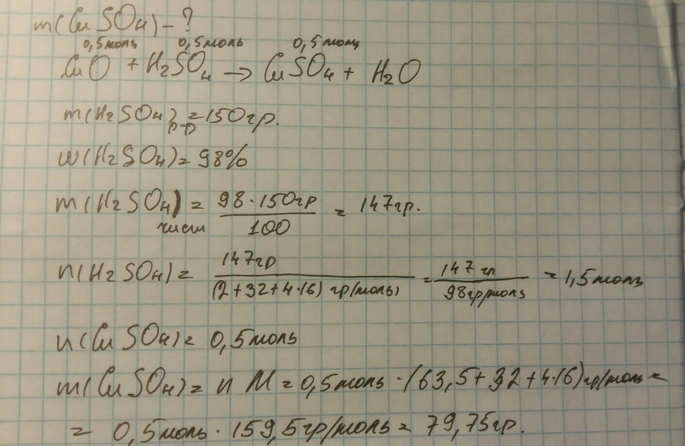 4. Вычислите массу сульфата меди (II), который может быть получен при взаимодействии оксида меди (II) c 98%-м раствором серной кислоты массой 150 г.