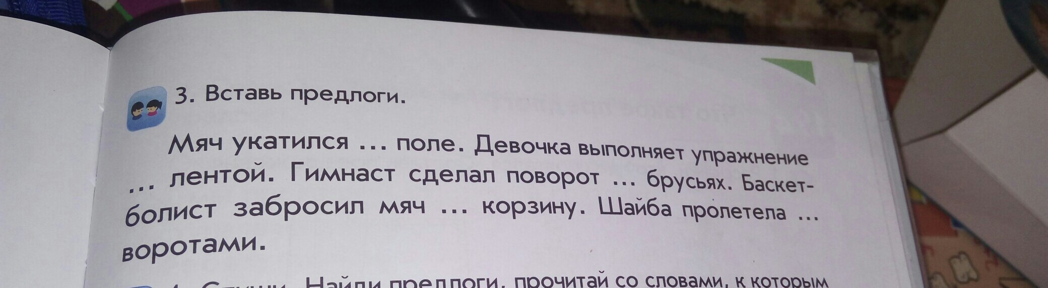 Мяч укатился в поле. Девочка выполняет упражнения с лентой. Гимнаст делает упражнение на брусьях. Баскетболист забросил мяч в корзину. Шайба пролетела над воротами.
