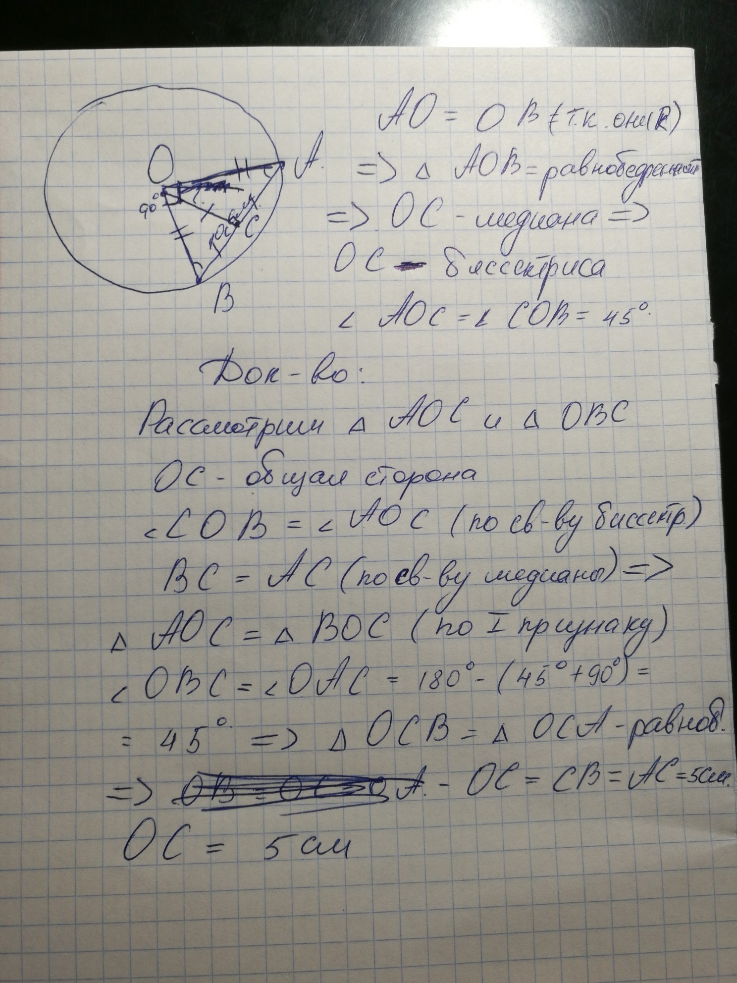 В окружности с центром O провежена хорда AB=10см. найдите длину перепендикуляра OC, проведенного к хорде AB, если угол AOB равен 90 градусов.