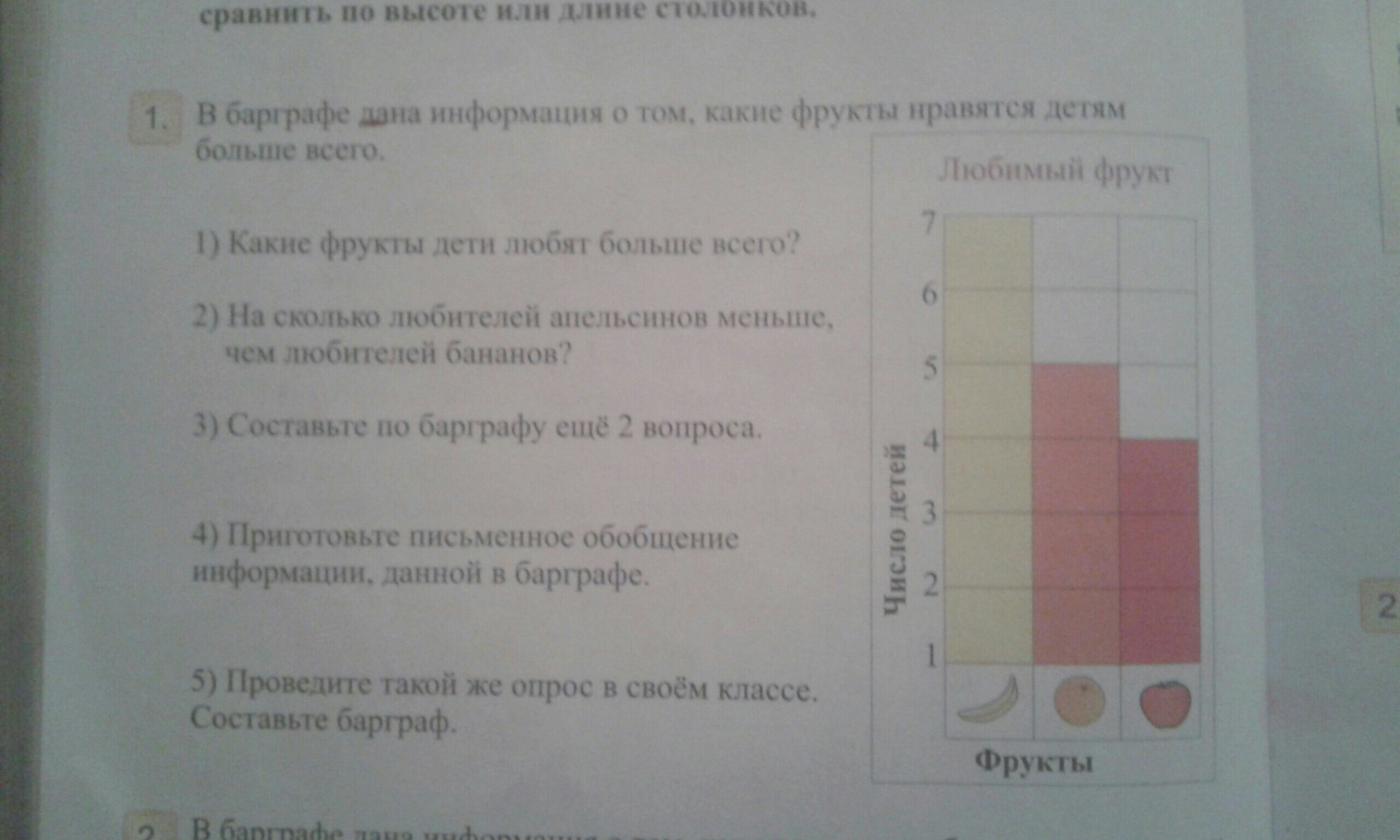 4)У банана 7 любителей, у апельсина - 5, у яблока - 4, Больше всего любят бананы.