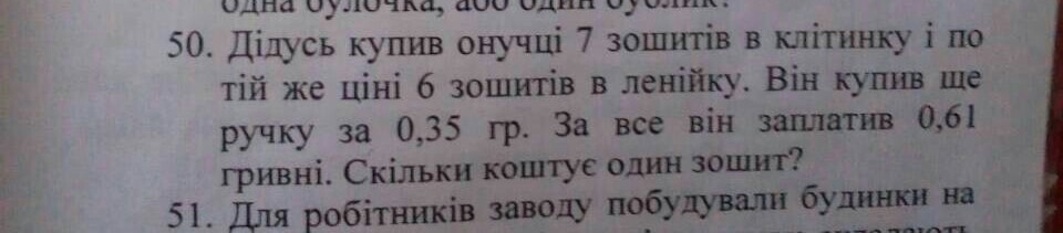 0,61-0,35=0,26гр 6+7=13 0,26:13= 0,02гр (коштує 1 зошит)