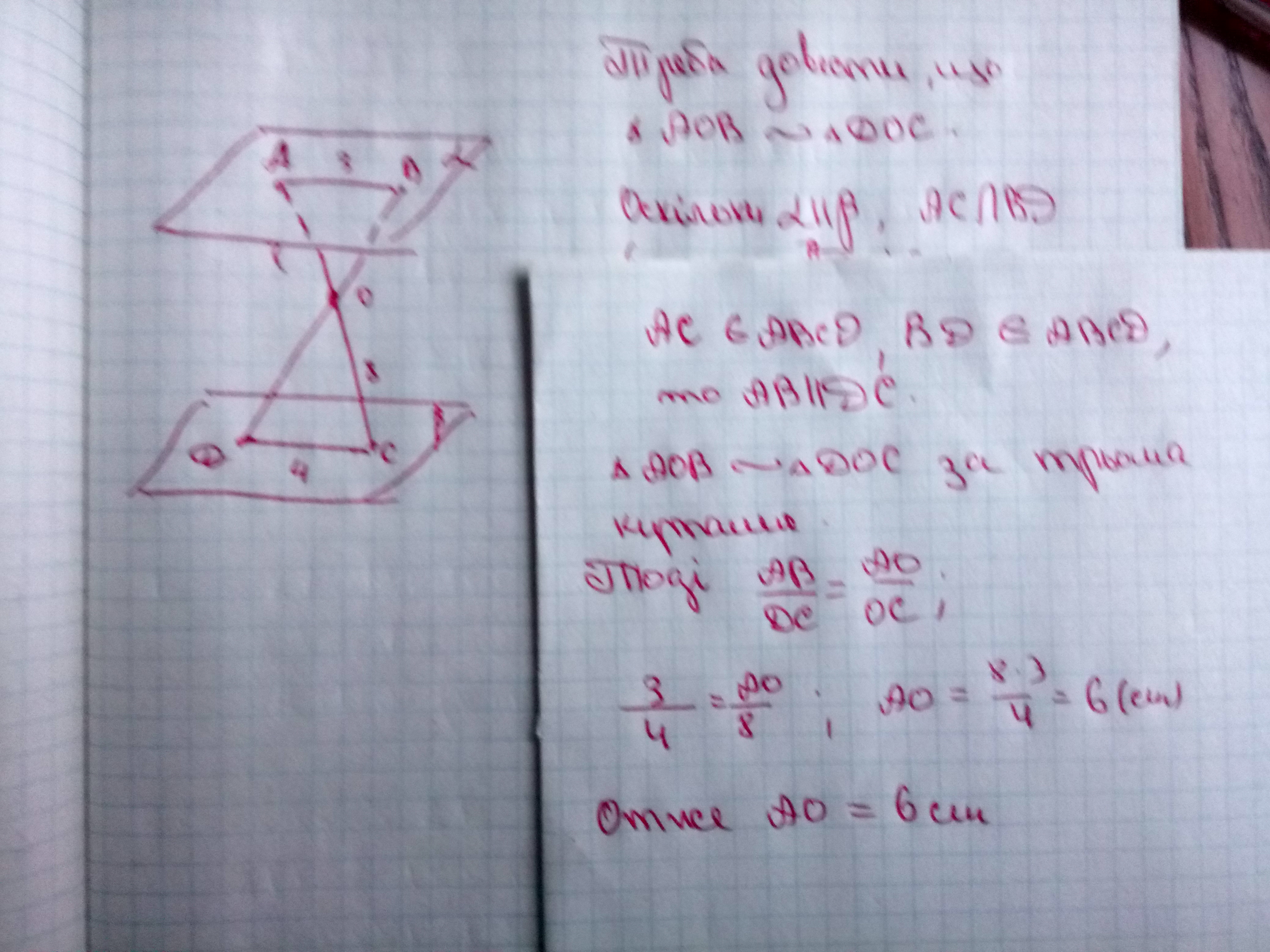 1) Дано дві паралельні площини альфа і бета. Точки А і В належать площині альфа, а точки С і D- площині бета. Відрізки AC i BD перетинаються в точці O. Знайдіть довжину відрізків АО, якщо AB=3см, DC=4см, OC=8см