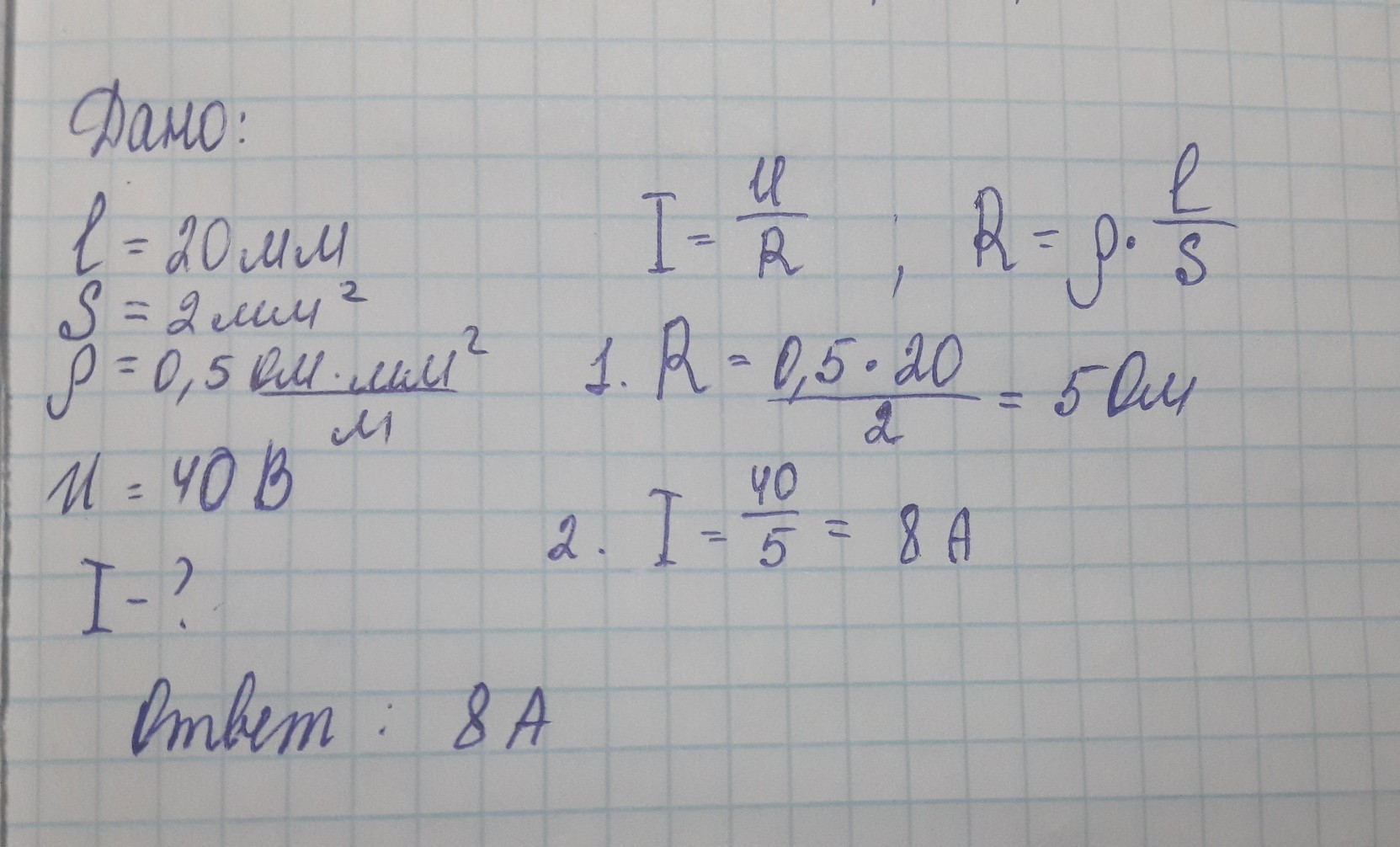 Определите силу тока на участке цепи,состоящей из проволоки длиной 20мм,сечением 2мм(в квадрате),если напряжение на концах этого участка равно 40В.Удельное сопротивление материала,из которого сделана проволока 0,5 Ом*мм(в квадрате)/м