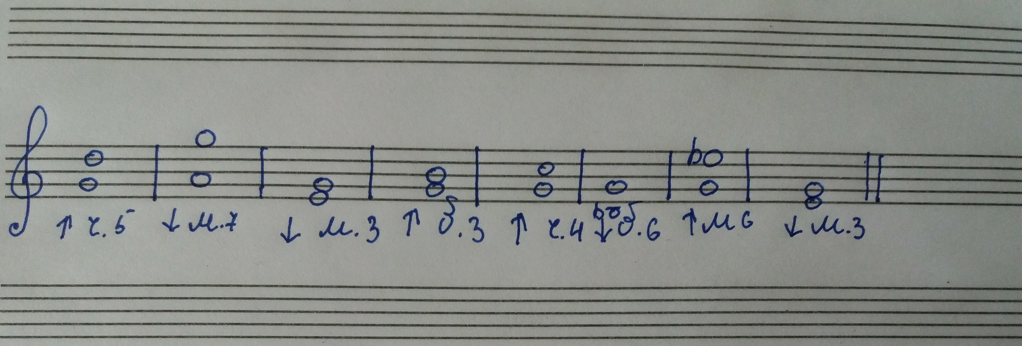 Помогите составить интервальную цепочку : ч5 от соль (вверх), м7 вниз, м3 вниз, б3 вверх, ч4 вверх, б6 вниз, б3 вниз, м6 вверх, м3 вниз.