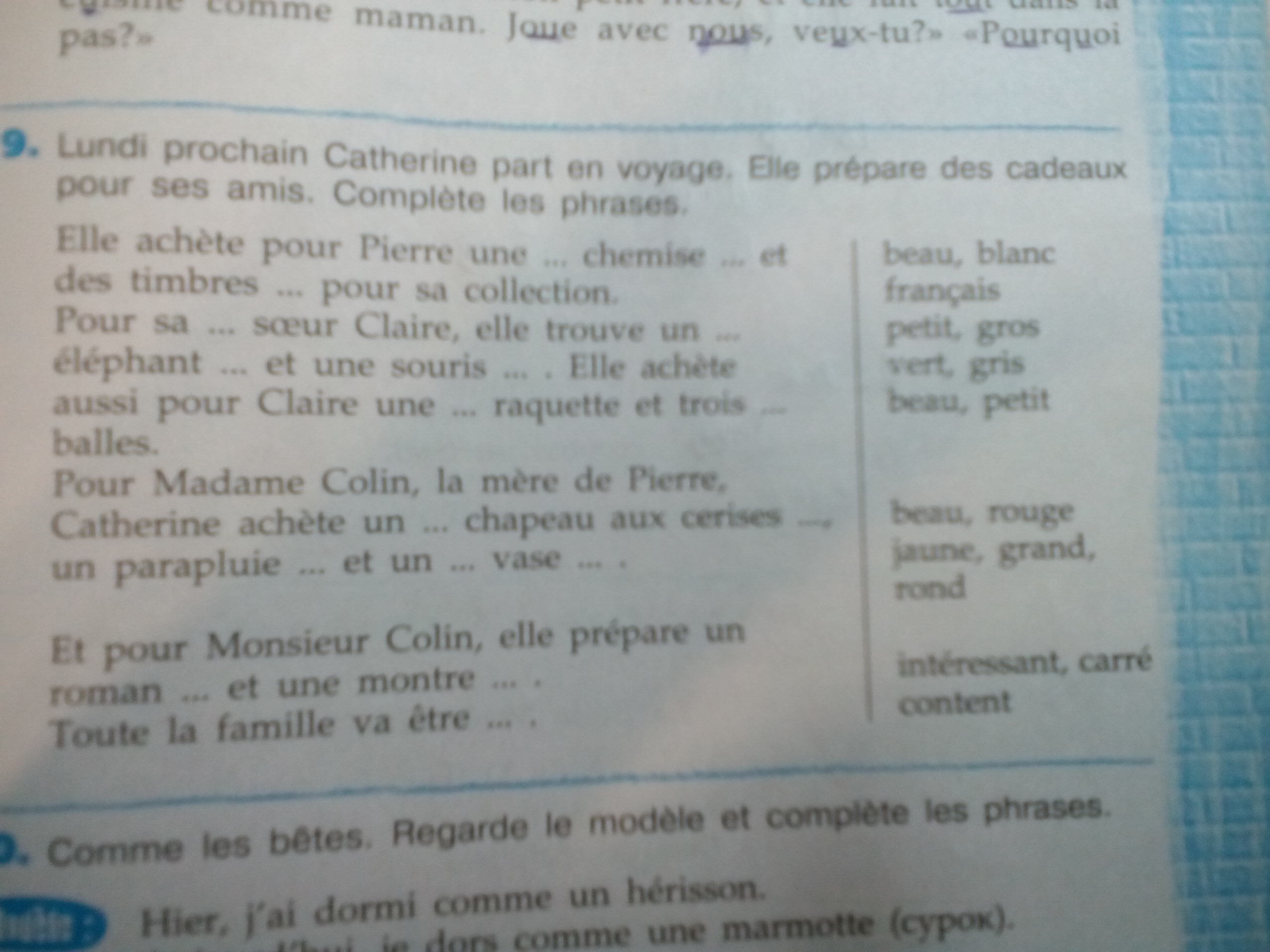 Elle achète pour pierre une belle chemise blanche et des timbres français pour sa collection.Pour sa petite sœur Claire, elle trouve un gros éléphant vert et une souris grise. Elle achète aussi pour Claire une belle raquette et trois petites balles.Pour Madame Colin la mère de Pierre, Catherine achète un beau chapeau aux cerises rouges, un parapluie jaune et un grand vase rond.Et pour Monsieur Colin elle prépare un roman intéressant et une montre carrée. Toute la famille va être contente.