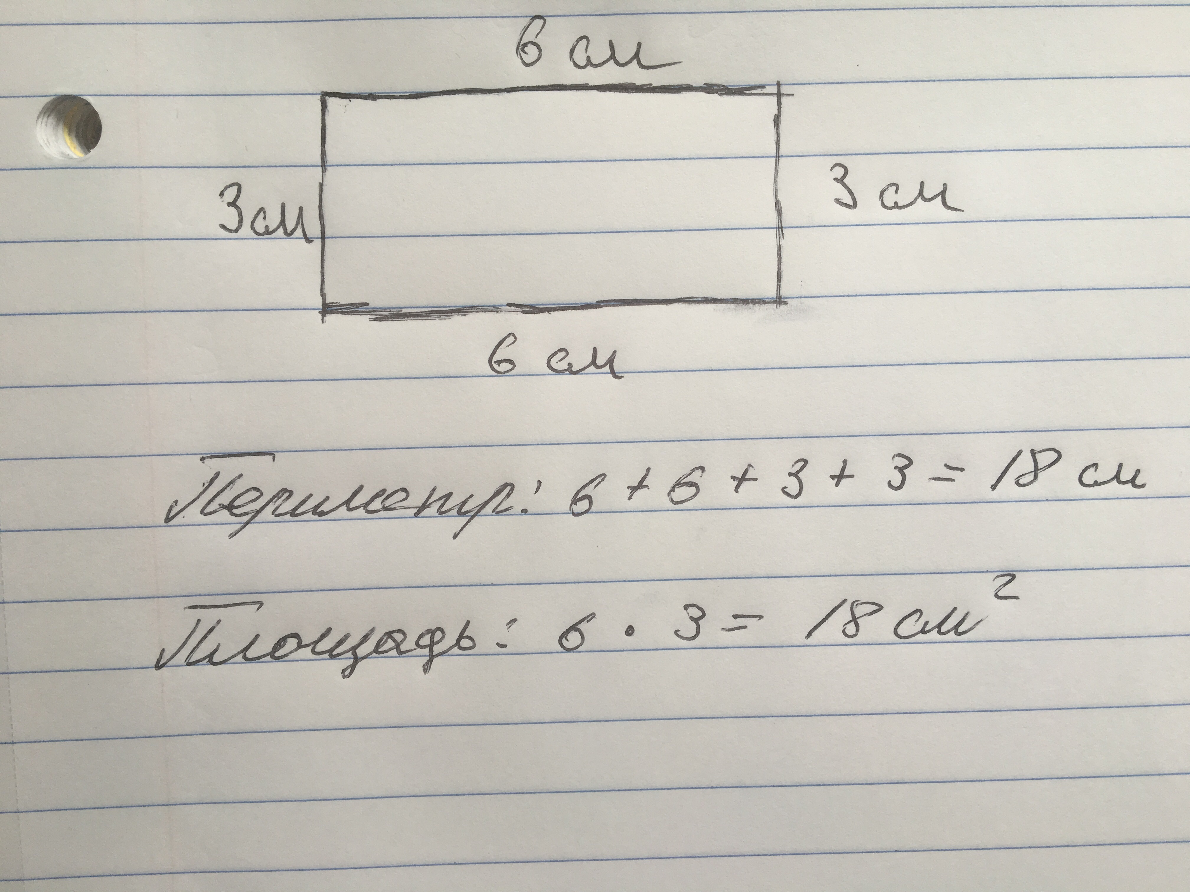 Построй прямоугольник, длинна одной стороны которого 6 см, а длинна другой в 2 раза меньше. Чему равны периметр и площадь этого прямоугольника?