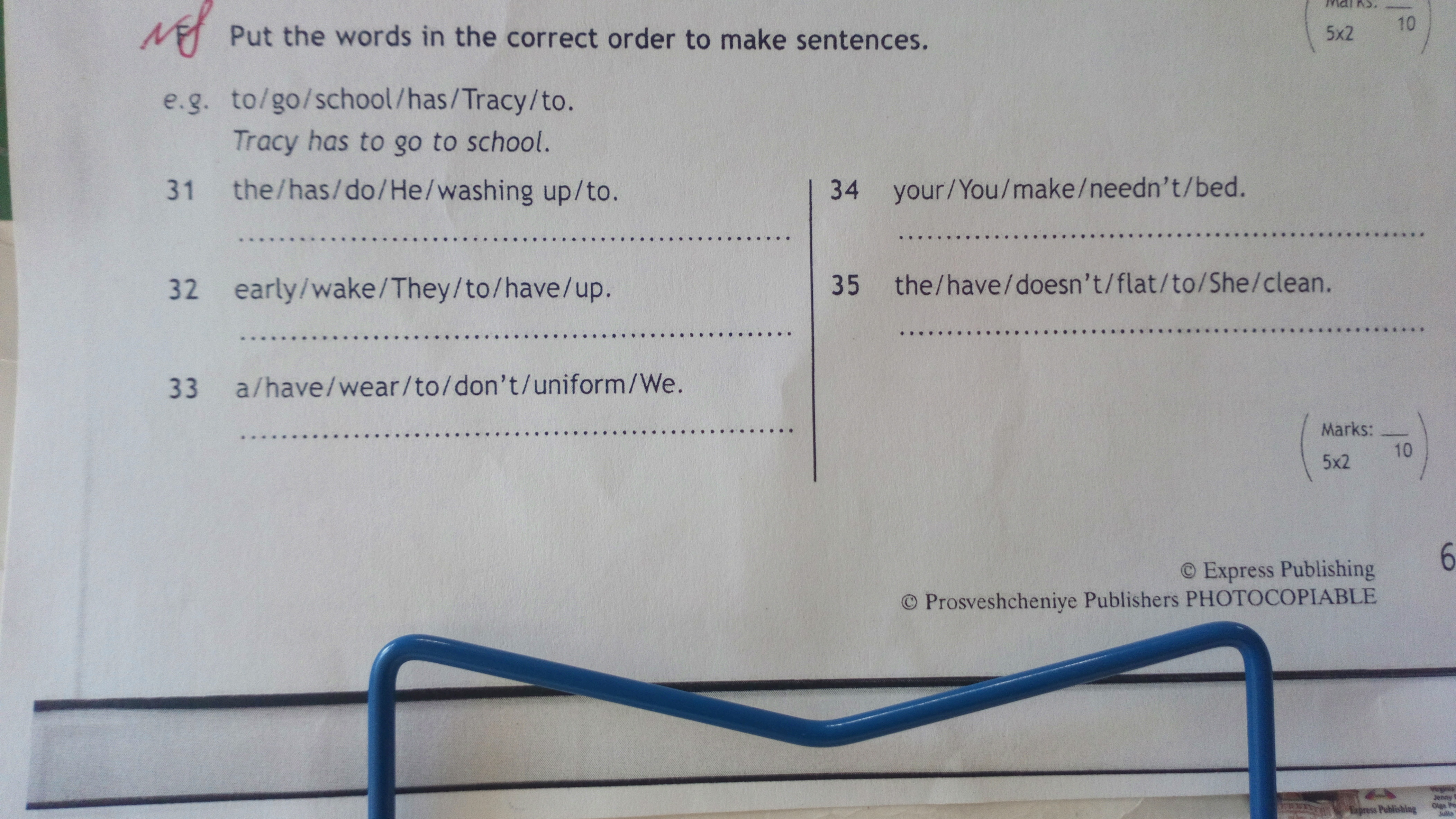 1. He has to do the washing up. 2 They have to wake up early. 3. We don't have to wear a uniform. 4. You needn't make your bed. 5.She doesn't have to clean the flat.