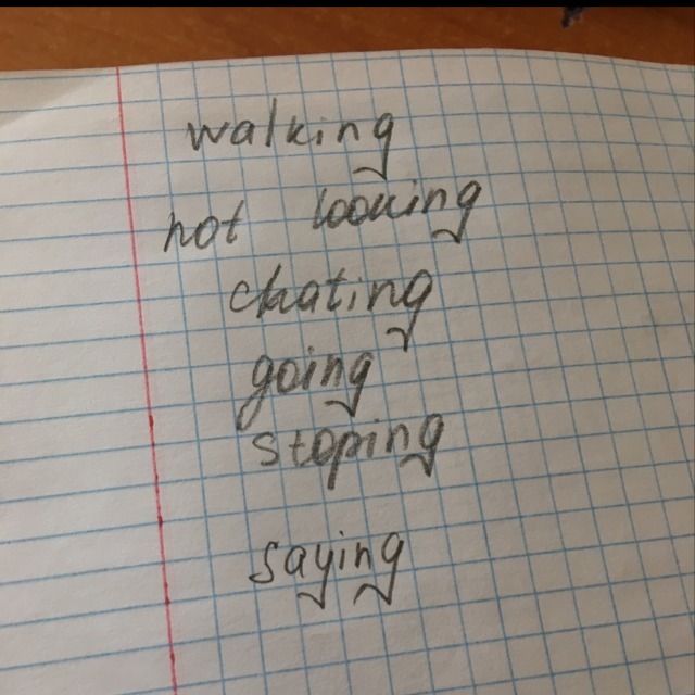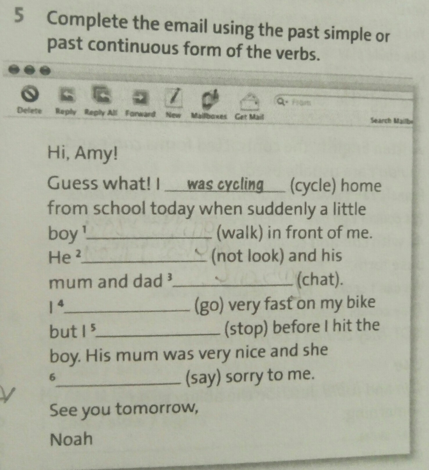 boy 2 (walked) in front of me. He was (not looking) and his mum and dad 3 were (chatting). I 4 was (going) very tast on my bike but I 5 (has stopped) before