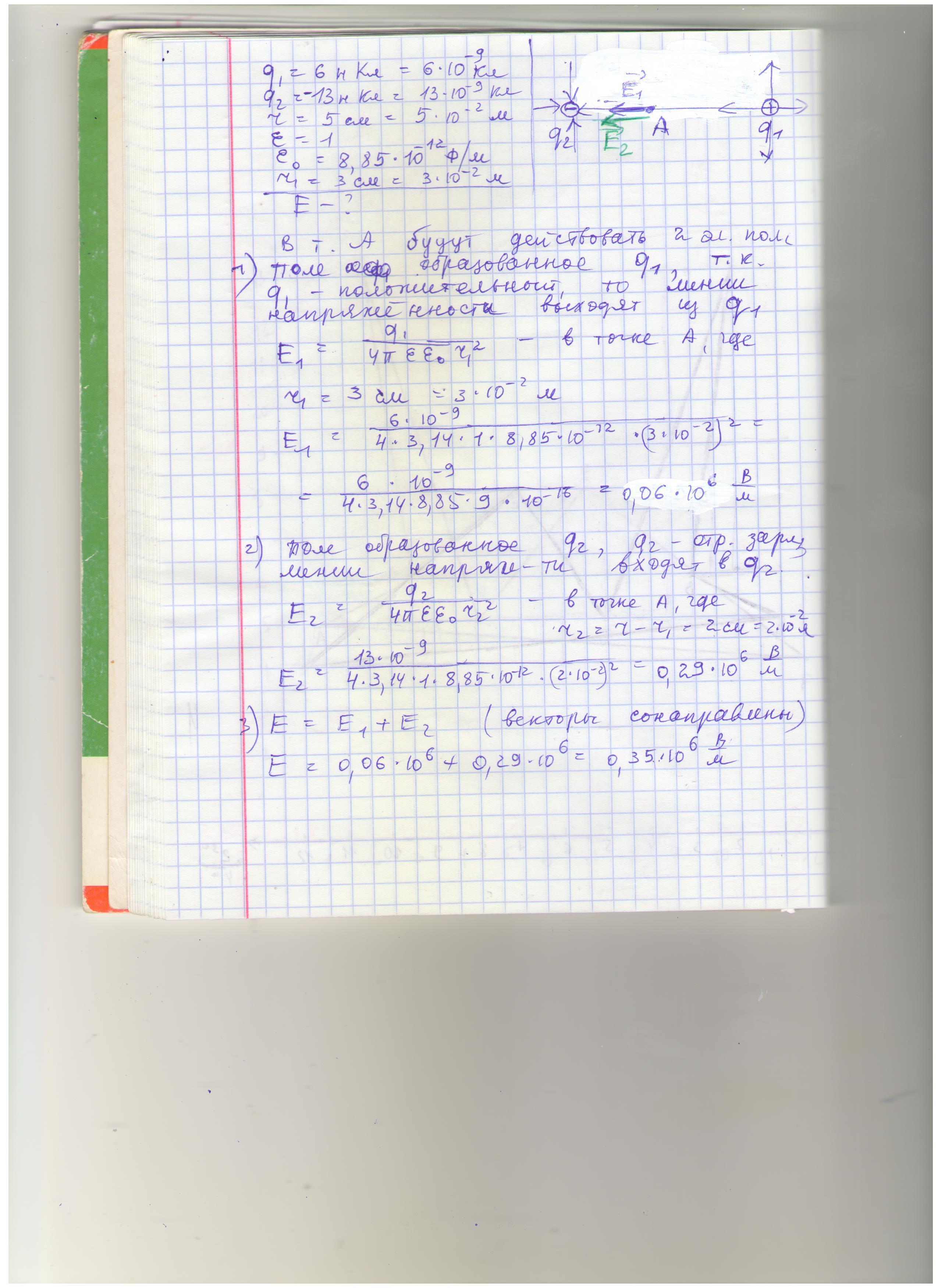 Два точечных заряда 6 и -13 нКл находятся на расстоянии 5 см друг от друга. Найти напряженность электрического поля в точке, расположенной на одной прямой с зарядами и на расстоянии 3 см слева от положительного заряда