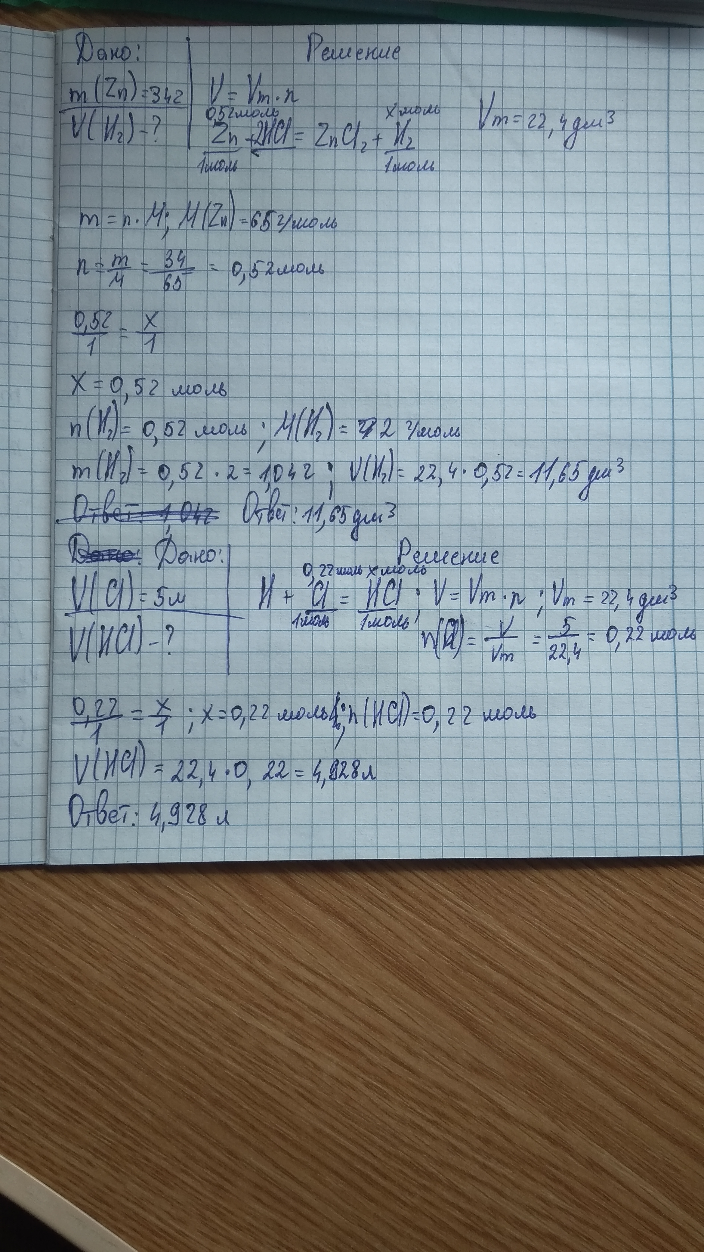 Рассчитайте объём водорода ( н.у.) полученного при взаимодействии 34 г. цинка с соляной кислотой.
