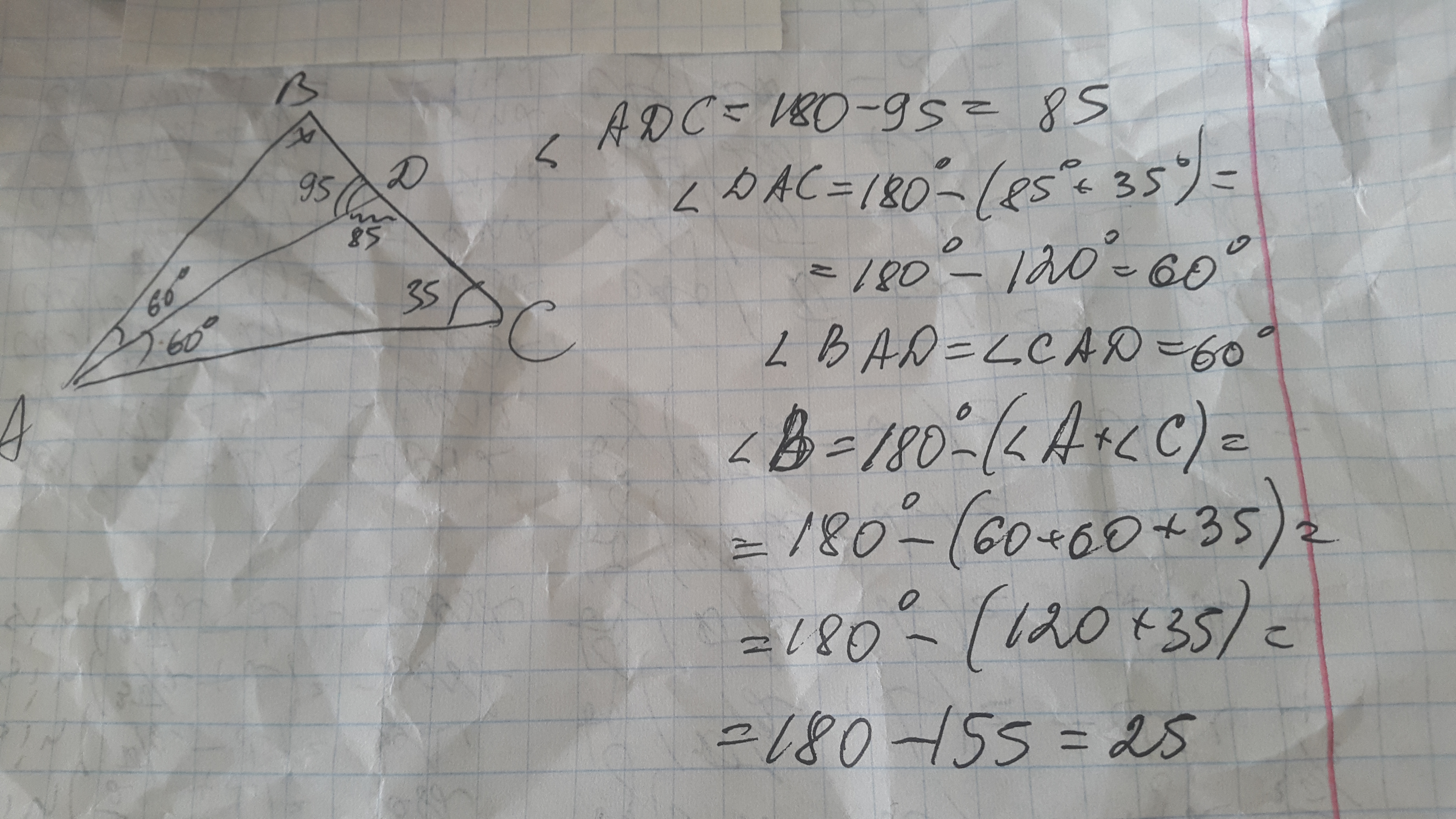 градусам Угол ADB=95 градусам, так как 180-(45+40)=50