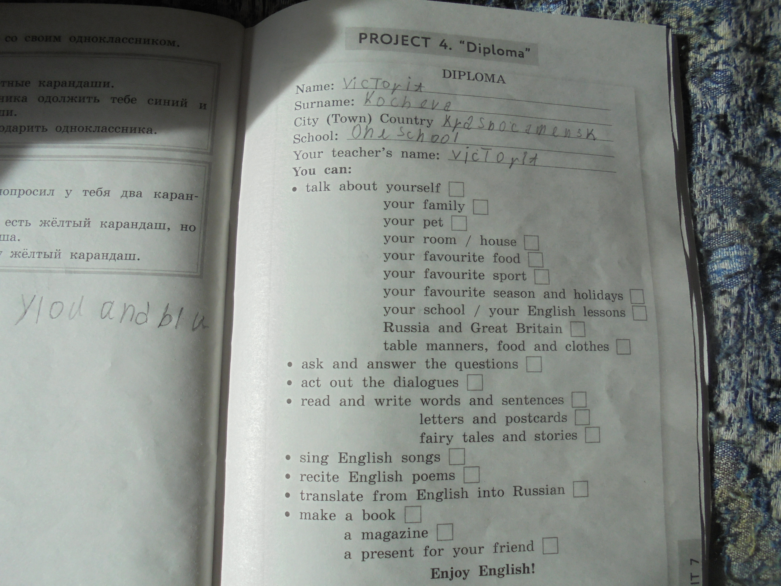в клеточках ставь галочки там где написано то что ты умеешь делать