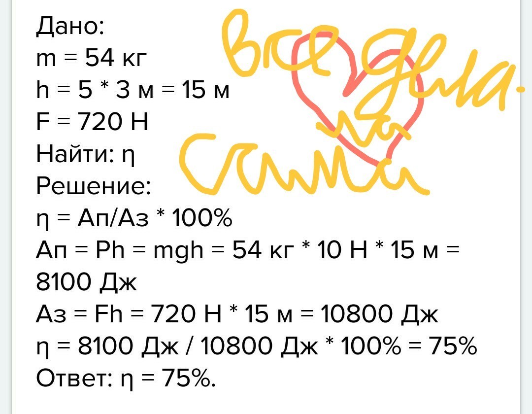 54 кг * 9,8 Н/кг / 720 Н=0,735=73,5%.