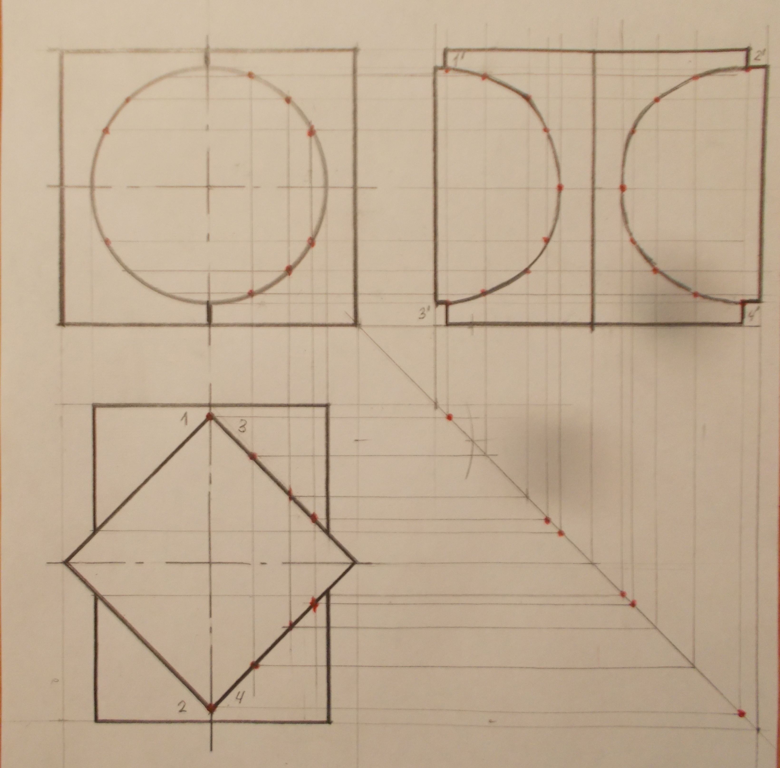 Построение лекальных кривых пересечения четырех угольной призмы и цилиндра начинается с определения точек пересечения этих тел. Они показаны красным цветом. Найди эти точки на всех проекциях с помощью линий проекционной связи. С помощью лекала обведи найденные в пересечениях линий проекционной связи точки, они на рисунке обозначены красным цветом.