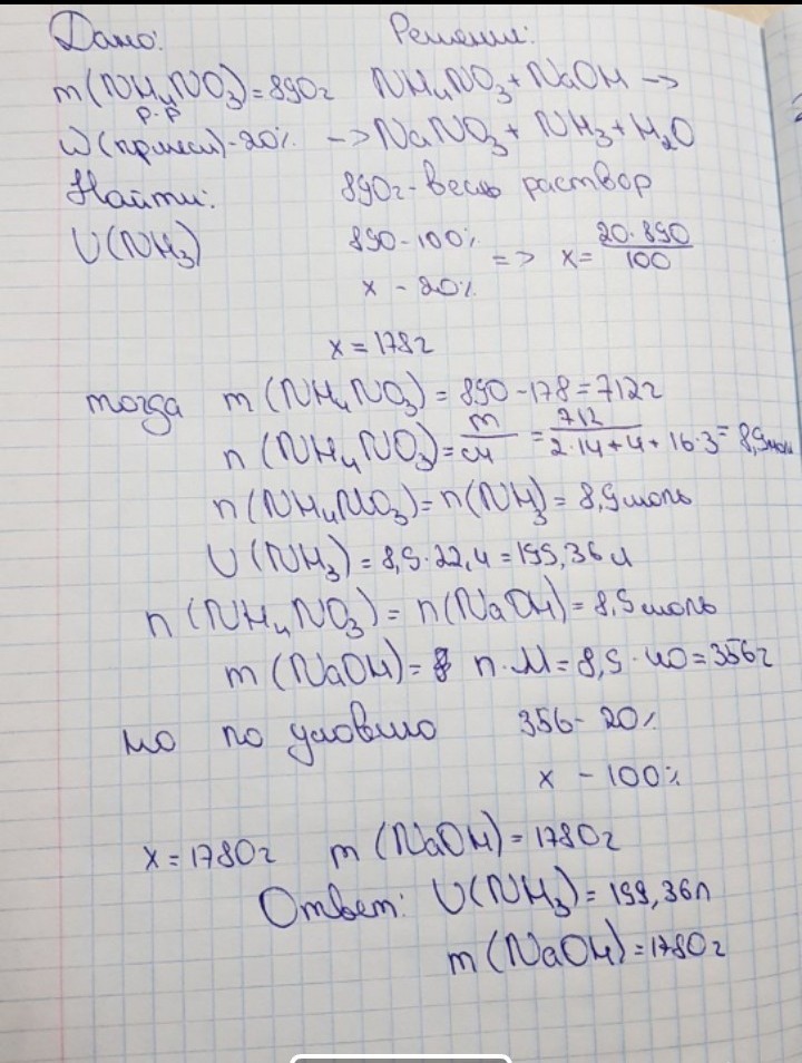 Вычислите объем аммиака который выделяется при взаимодействии 890 г нитрита аммония содержащего 20% примесей с раствором гидроксида натрия. сколько граммов 80 процентного раствора щелочи потребуется для реакции?