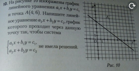 на рисунке изображён график линейного уравнения a1x+b1y=c1 и точка а(4,6). напишите линейное уравнение a2x+b2y=c2, график которого проходит через точку а, и система етих линейных уравнений не имела решения