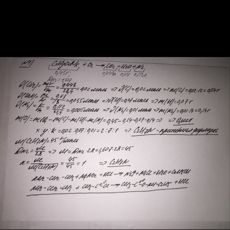 1) При сгорании 0,45 г газообразного органического вещества образовалось 0,448 л (н.у.) углекислого газа, 0,63 г воды и 0,112 л (н.у.) азота. Плотность исходного вещества по азоту 1,607.